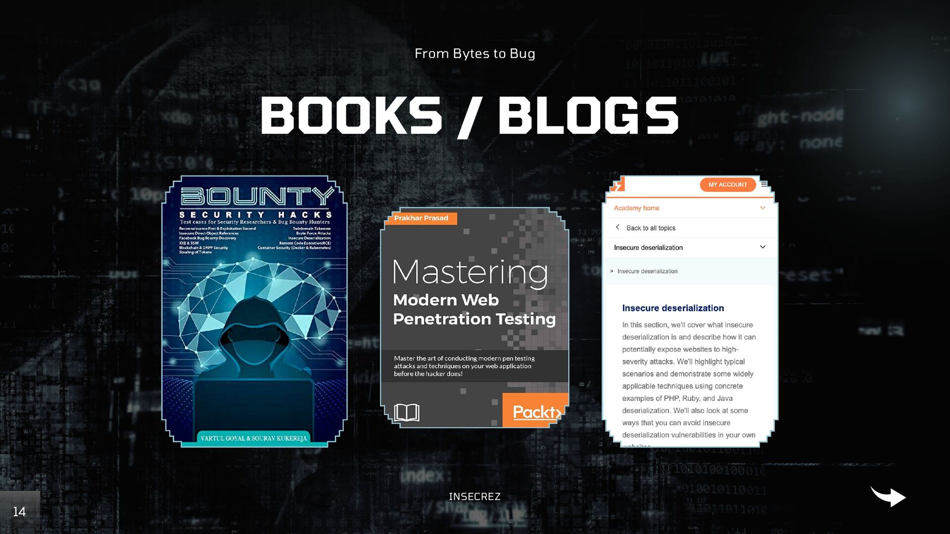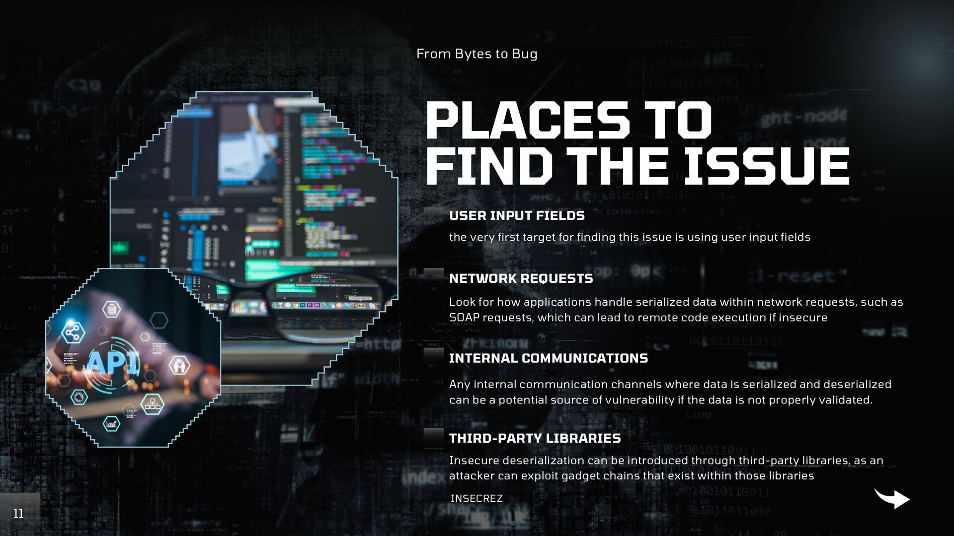 target for finding this issue is using user input fields USER INPUT FIELDS Look for how applications handle serialized data within network requests, such as SOAP requests, which can lead to remote code execution if insecure NETWORK REQUESTS From Bytes to Bug INTERNAL COMMUNICATIONS Any internal communication channels where data is serialized and deserialized can be a potential source of vulnerability if the data is not properly validated. THIRD-PARTY LIBRARIES Insecure deserialization can be introduced through third-party libraries, as an attacker can exploit gadget chains that exist within those libraries