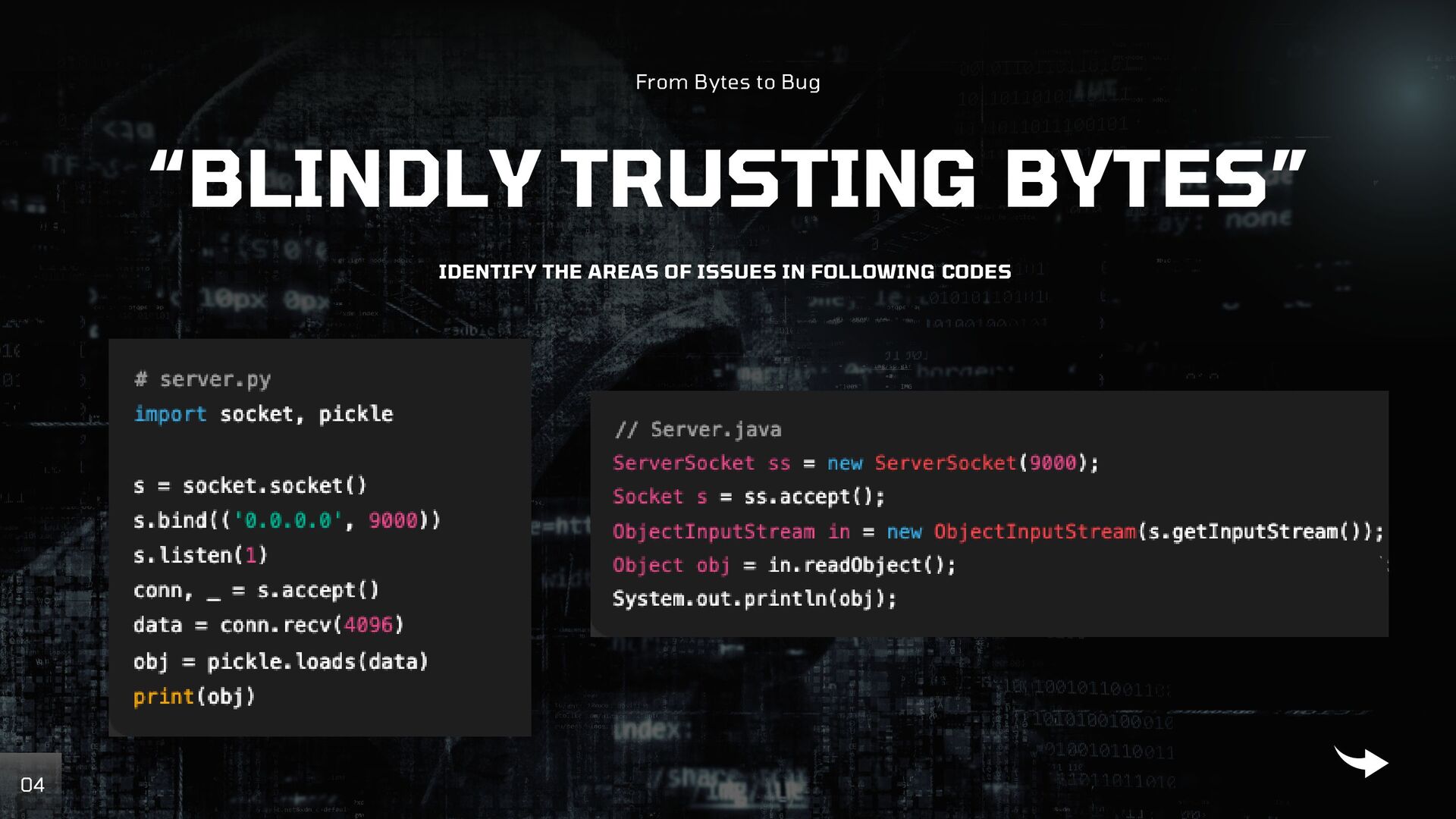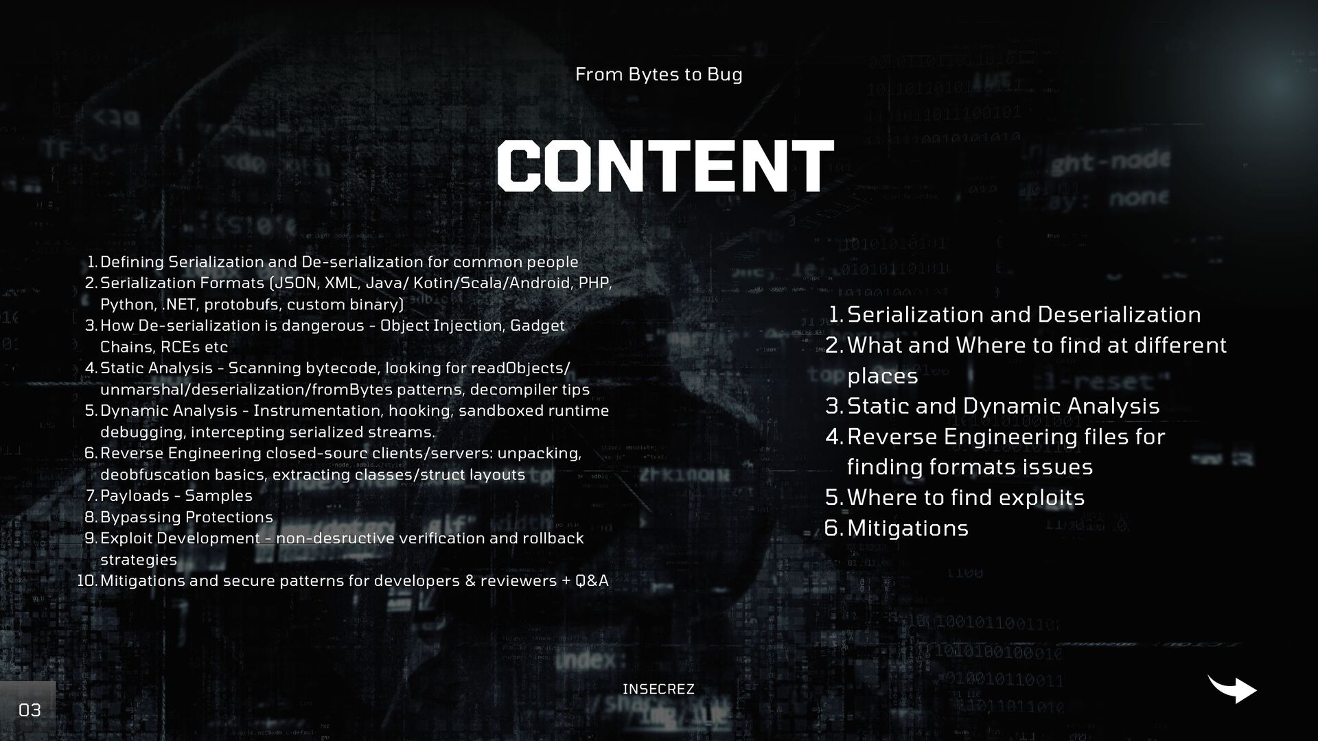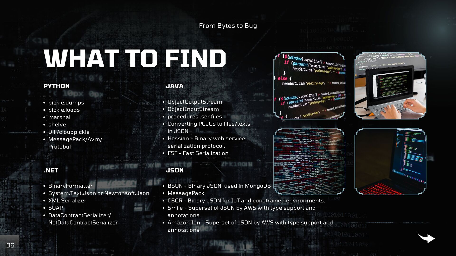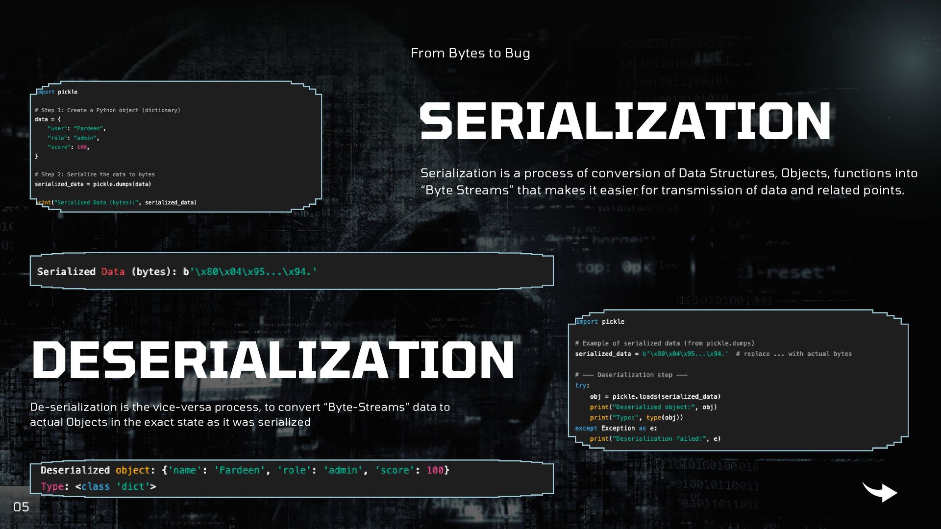 Structures, Objects, functions into “Byte Streams” that makes it easier for transmission of data and related points. 05 From Bytes to Bug DESERIALIZATION De-serialization is the vice-versa process, to convert “Byte-Streams” data to actual Objects in the exact state as it was serialized