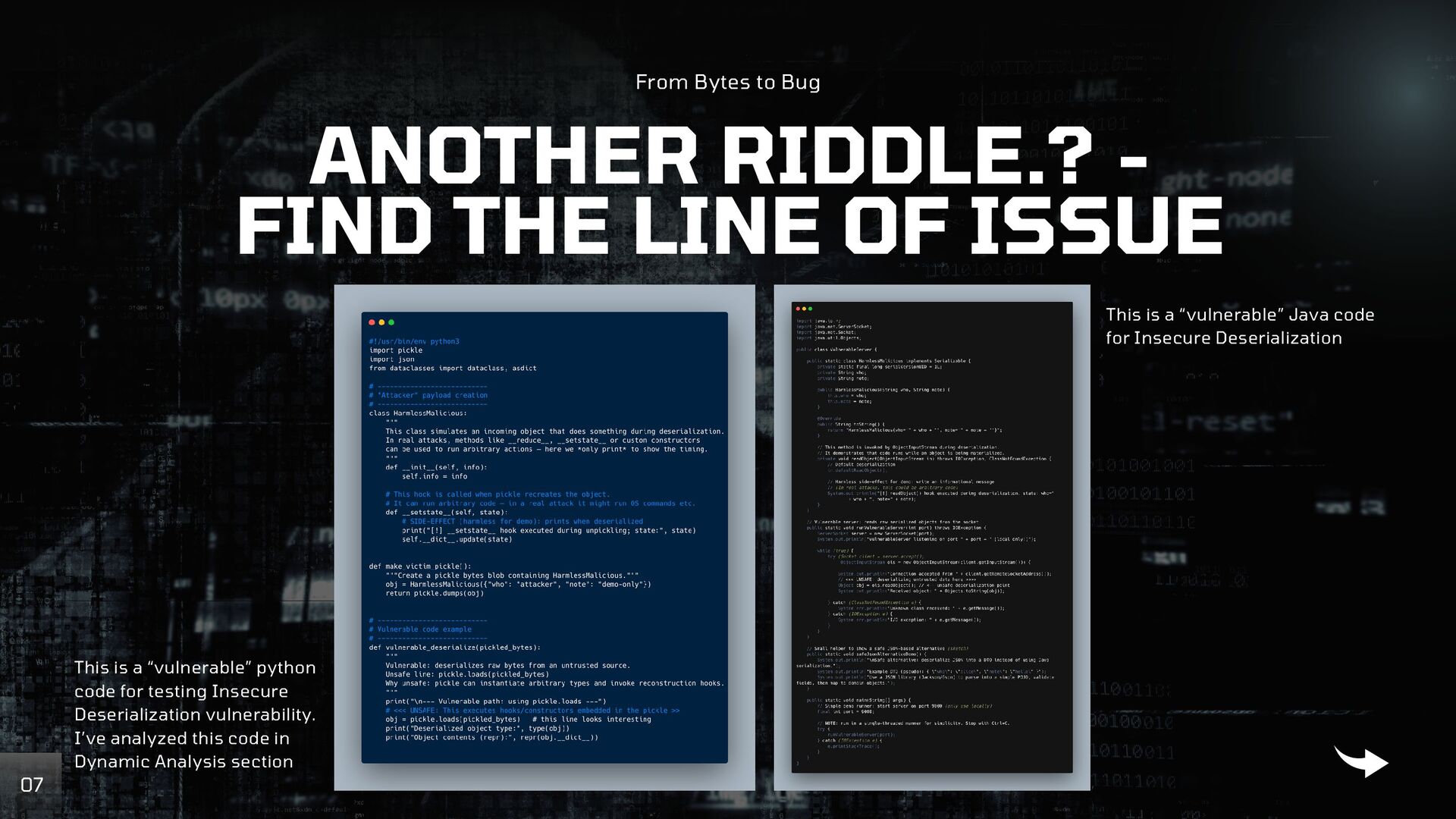 Bytes to Bug This is a “vulnerable” python code for testing Insecure Deserialization vulnerability. I’ve analyzed this code in Dynamic Analysis section This is a “vulnerable” Java code for Insecure Deserialization