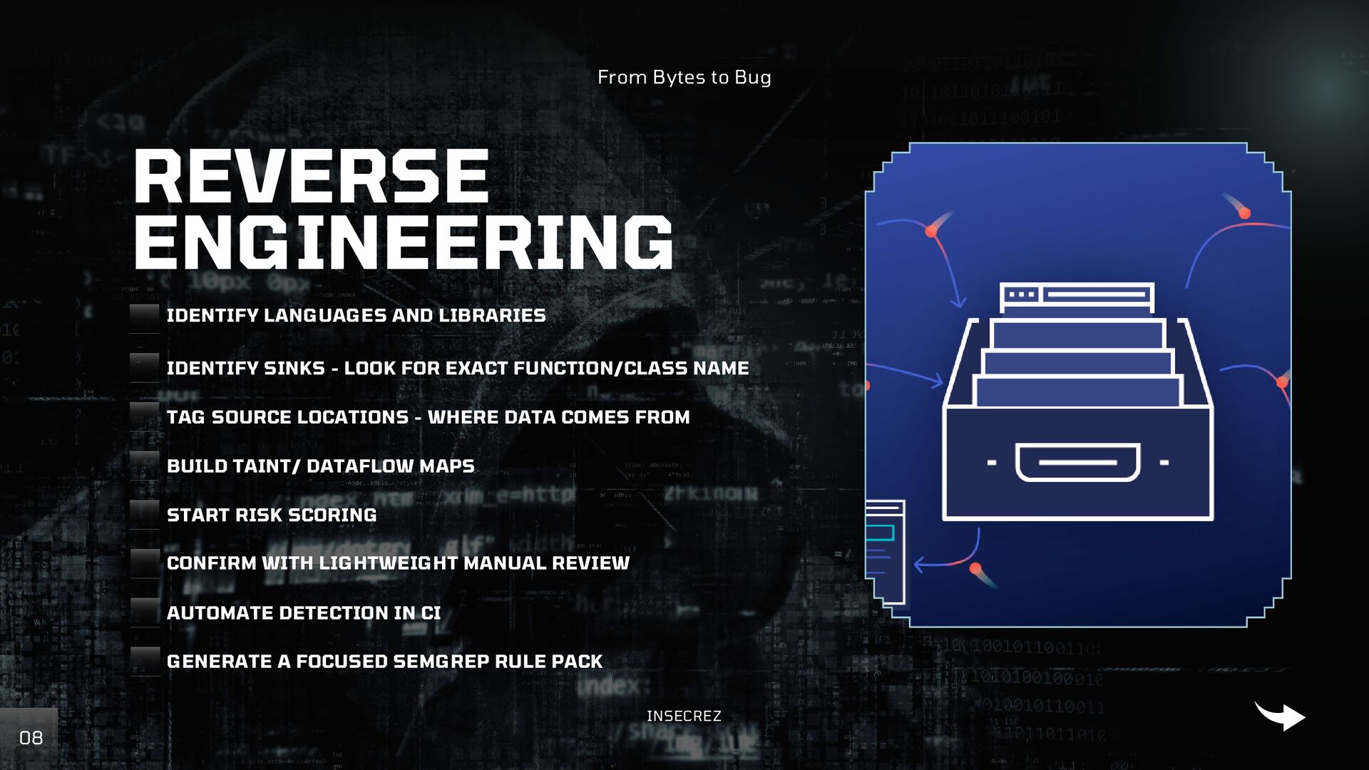 - LOOK FOR EXACT FUNCTION/CLASS NAME From Bytes to Bug TAG SOURCE LOCATIONS - WHERE DATA COMES FROM BUILD TAINT/ DATAFLOW MAPS START RISK SCORING CONFIRM WITH LIGHTWEIGHT MANUAL REVIEW AUTOMATE DETECTION IN CI GENERATE A FOCUSED SEMGREP RULE PACK