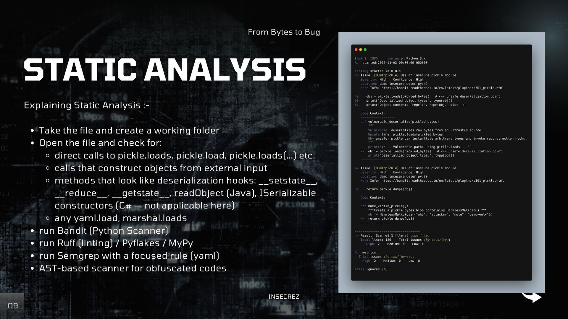 Analysis :- Take the file and create a working folder Open the file and check for: direct calls to pickle.loads, pickle.load, pickle.loads(...) etc. calls that construct objects from external input methods that look like deserialization hooks: __setstate__, __reduce__, __getstate__, readObject (Java), ISerializable constructors (C# — not applicable here) any yaml.load, marshal.loads run Bandit (Python Scanner) run Ruff (linting) / Pyflakes / MyPy run Semgrep with a focused rule (yaml) AST-based scanner for obfuscated codes