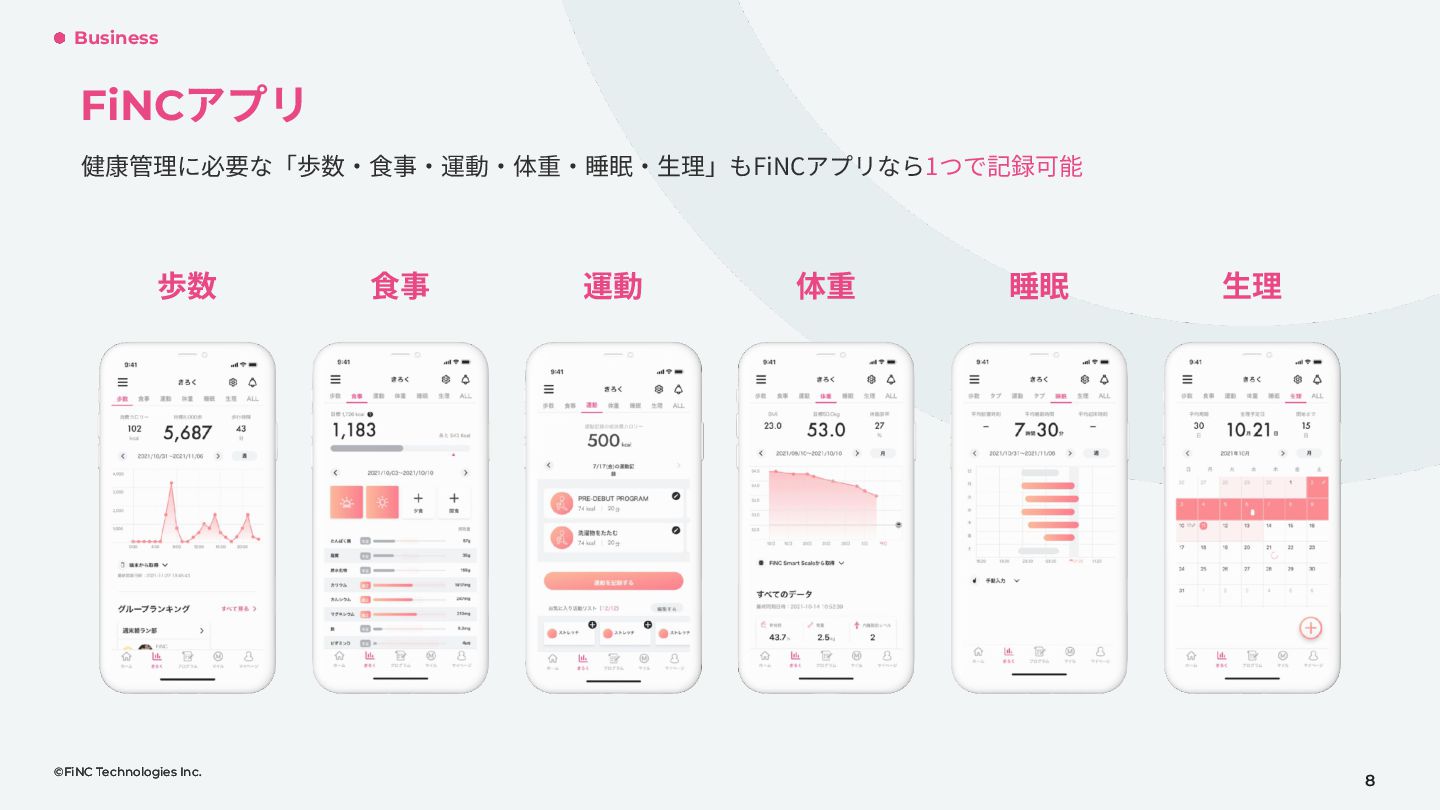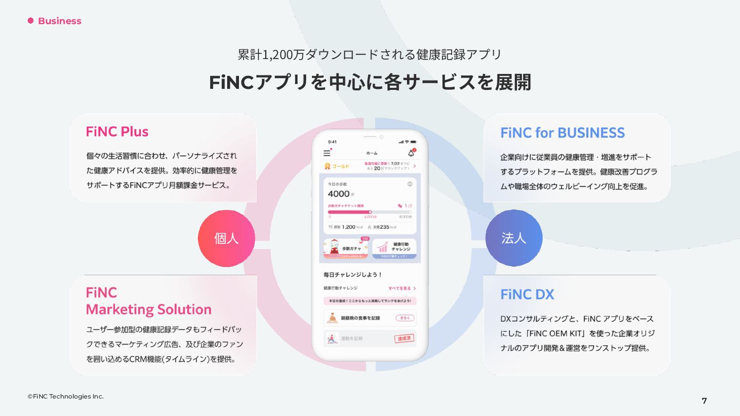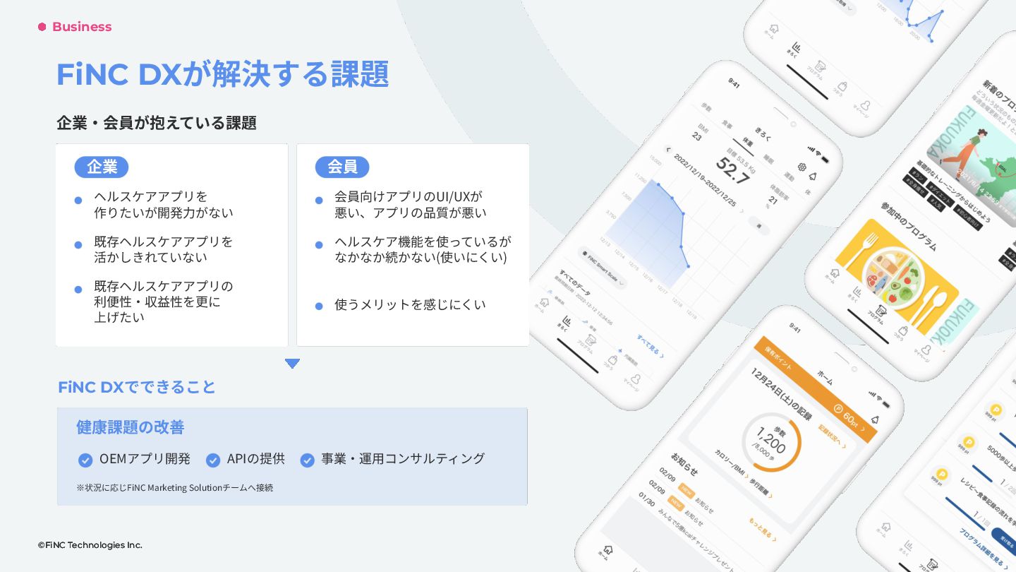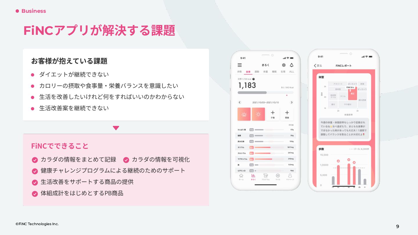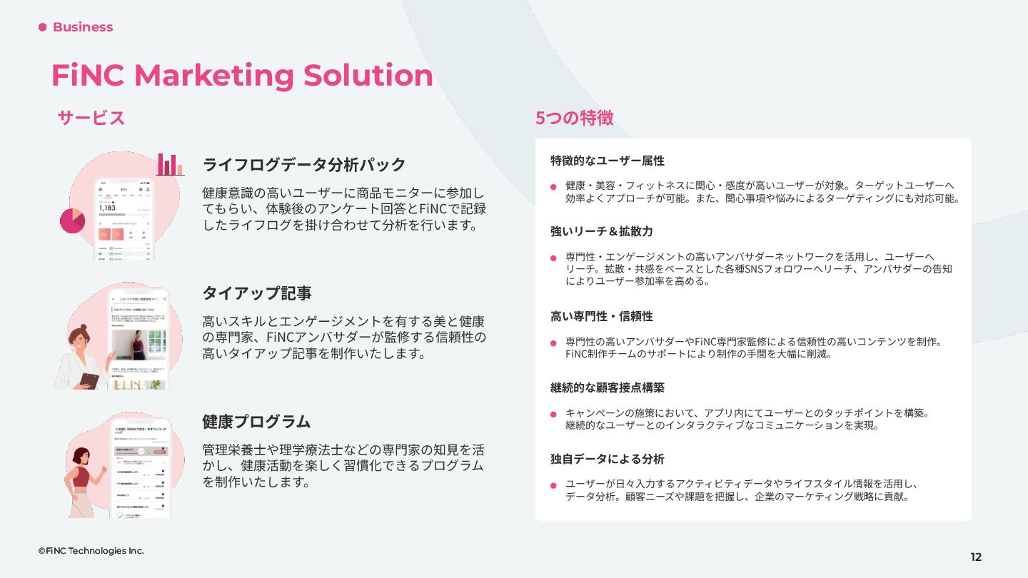 Solution サービス ライフログデータ分析パック 健康意識の⾼いユーザーに商品モニターに参加し てもらい、体験後のアンケート回答とFiNCで記録 したライフログを掛け合わせて分析を⾏います。 タイアップ記事 ⾼いスキルとエンゲージメントを有する美と健康 の専⾨家、FiNCアンバサダーが監修する信頼性の ⾼いタイアップ記事を制作いたします。 健康プログラム 管理栄養⼠や理学療法⼠などの専⾨家の知⾒を活 かし、健康活動を楽しく習慣化できるプログラム を制作いたします。 5つの特徴 特徴的なユーザー属性 健康‧美容‧フィットネスに関⼼‧感度が⾼いユーザーが対象。ターゲットユーザーへ 効率よくアプローチが可能。また、関⼼事項や悩みによるターゲティングにも対応可能。 強いリーチ&拡散⼒ 専⾨性‧エンゲージメントの⾼いアンバサダーネットワークを活⽤し、ユーザーへ リーチ。拡散‧共感をベースとした各種SNSフォロワーへリーチ、アンバサダーの告知 によりユーザー参加率を⾼める。 ⾼い専⾨性‧信頼性 専⾨性の⾼いアンバサダーやFiNC専⾨家監修による信頼性の⾼いコンテンツを制作。 FiNC制作チームのサポートにより制作の⼿間を⼤幅に削減。 継続的な顧客接点構築 キャンペーンの施策において、アプリ内にてユーザーとのタッチポイントを構築。 継続的なユーザーとのインタラクティブなコミュニケーションを実現。 独⾃データによる分析 ユーザーが⽇々⼊⼒するアクティビティデータやライフスタイル情報を活⽤し、 データ分析。顧客ニーズや課題を把握し、企業のマーケティング戦略に貢献。