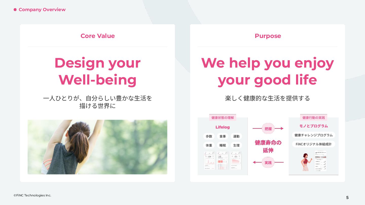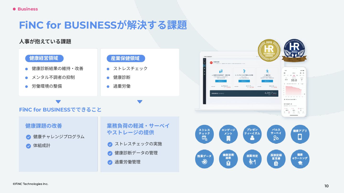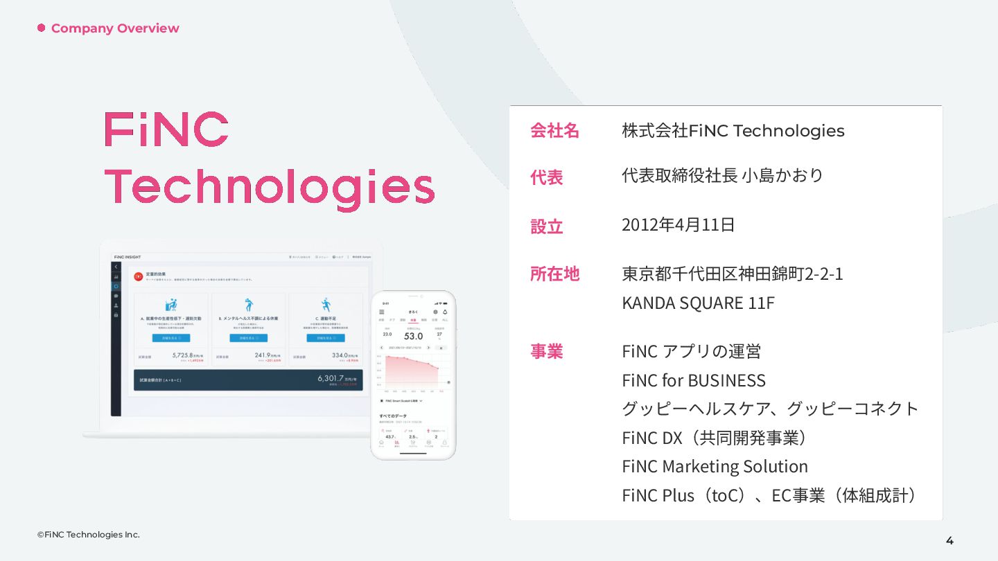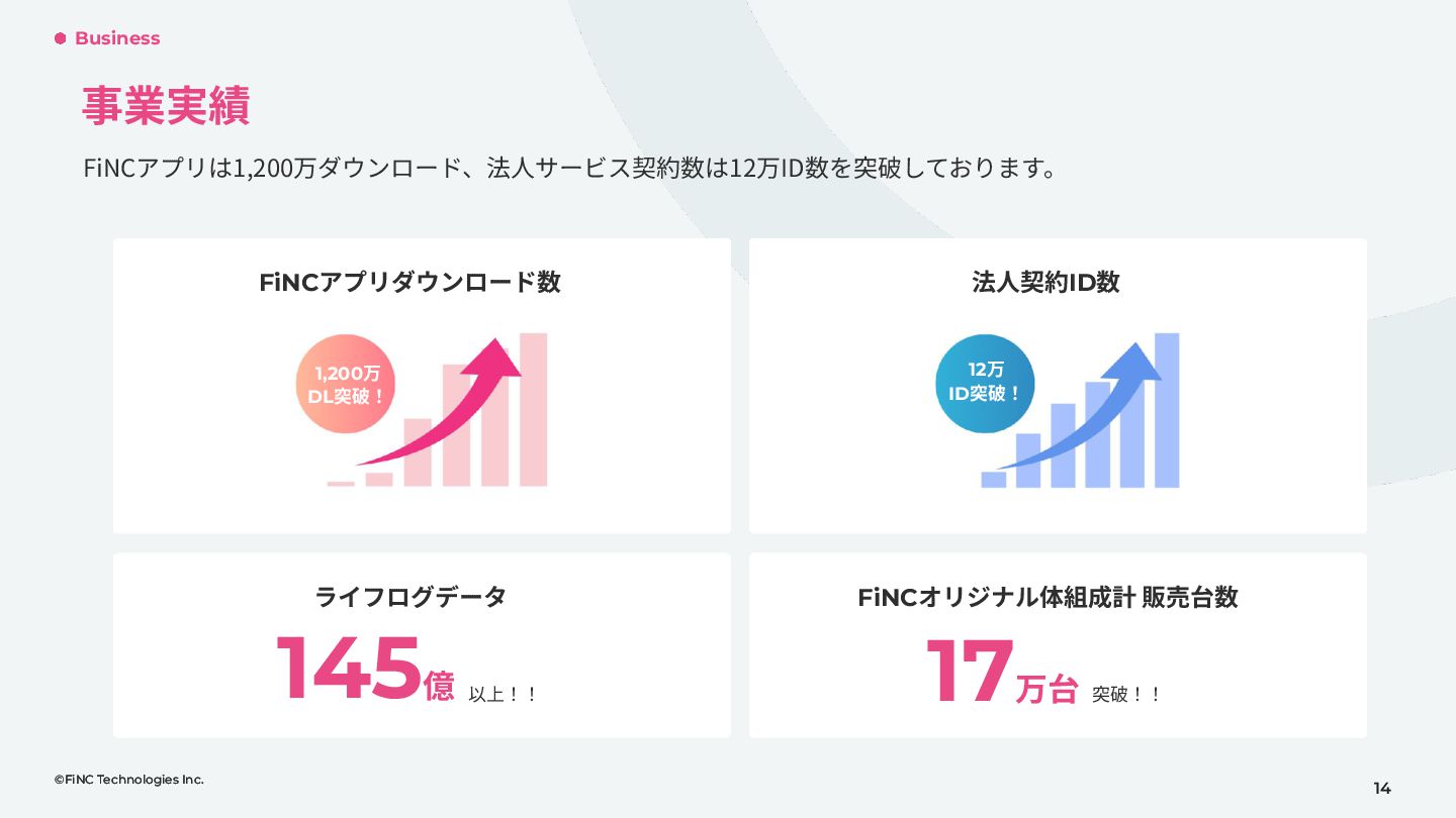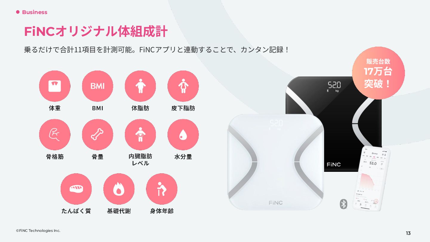 Solution サービス ライフログデータ分析パック 健康意識の⾼いユーザーに商品モニターに参加し てもらい、体験後のアンケート回答とFiNCで記録 したライフログを掛け合わせて分析を⾏います。 タイアップ記事 ⾼いスキルとエンゲージメントを有する美と健康 の専⾨家、FiNCアンバサダーが監修する信頼性の ⾼いタイアップ記事を制作いたします。 健康プログラム 管理栄養⼠や理学療法⼠などの専⾨家の知⾒を活 かし、健康活動を楽しく習慣化できるプログラム を制作いたします。 5つの特徴 特徴的なユーザー属性 健康‧美容‧フィットネスに関⼼‧感度が⾼いユーザーが対象。ターゲットユーザーへ 効率よくアプローチが可能。また、関⼼事項や悩みによるターゲティングにも対応可能。 強いリーチ&拡散⼒ 専⾨性‧エンゲージメントの⾼いアンバサダーネットワークを活⽤し、ユーザーへ リーチ。拡散‧共感をベースとした各種SNSフォロワーへリーチ、アンバサダーの告知 によりユーザー参加率を⾼める。 ⾼い専⾨性‧信頼性 専⾨性の⾼いアンバサダーやFiNC専⾨家監修による信頼性の⾼いコンテンツを制作。 FiNC制作チームのサポートにより制作の⼿間を⼤幅に削減。 継続的な顧客接点構築 キャンペーンの施策において、アプリ内にてユーザーとのタッチポイントを構築。 継続的なユーザーとのインタラクティブなコミュニケーションを実現。 独⾃データによる分析 ユーザーが⽇々⼊⼒するアクティビティデータやライフスタイル情報を活⽤し、 データ分析。顧客ニーズや課題を把握し、企業のマーケティング戦略に貢献。