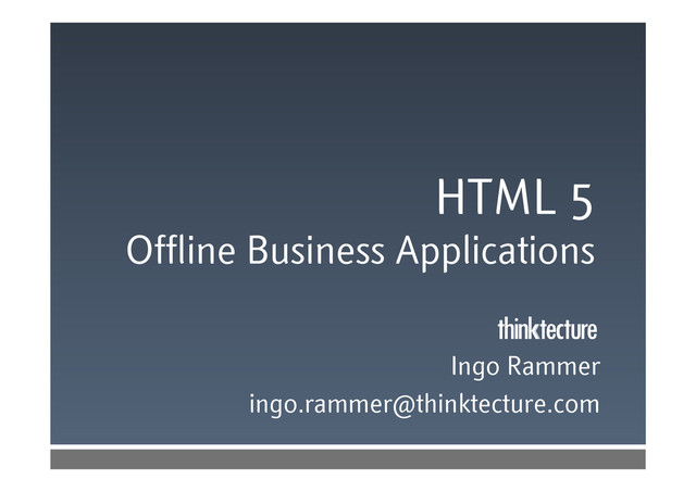 Session abstract: HTML5 allows the creation of line of business applications which rely on the browser’s offline storage capabilities for application and data. These applications can provide user experiences comparable to native applications and allow large percentages of code and markup reuse between Desktop, Android, iOS and the most recent Blackberry OSes (and Windows Phone 7 in November 2011). In this session, you will learn about the capabilities of HTML5 which pertain to these kinds of applications, about the frameworks which can help you create offline business applications and about the pitfalls and uncharted/semicharted areas you will have to enter.