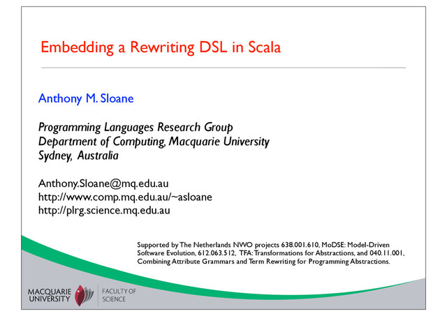 Tutorial Anthony M. Sloane Programming Languages Research Group Department of Computing, Macquarie University Sydney, Australia [email protected] http://www.comp.mq.edu.au/~asloane http://plrg.science.mq.edu.au Embedding a Rewriting DSL in Scala Supported by The Netherlands NWO projects 638.001.610, MoDSE: Model-Driven Software Evolution, 612.063.512, TFA: Transformations for Abstractions, and 040.11.001, Combining Attribute Grammars and Term Rewriting for Programming Abstractions.