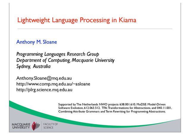 Tutorial Anthony M. Sloane Programming Languages Research Group Department of Computing, Macquarie University Sydney, Australia [email protected] http://www.comp.mq.edu.au/~asloane http://plrg.science.mq.edu.au Lightweight Language Processing in Kiama Supported by The Netherlands NWO projects 638.001.610, MoDSE: Model-Driven Software Evolution, 612.063.512, TFA: Transformations for Abstractions, and 040.11.001, Combining Attribute Grammars and Term Rewriting for Programming Abstractions.