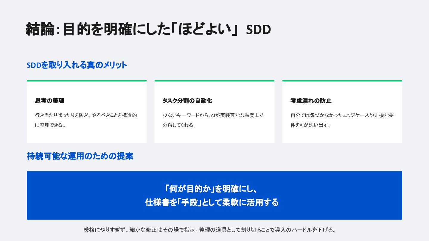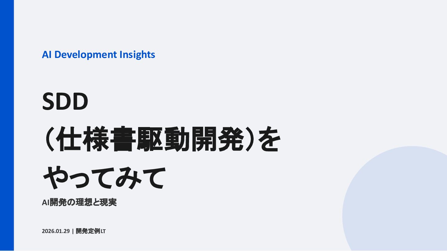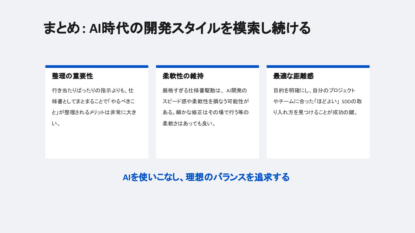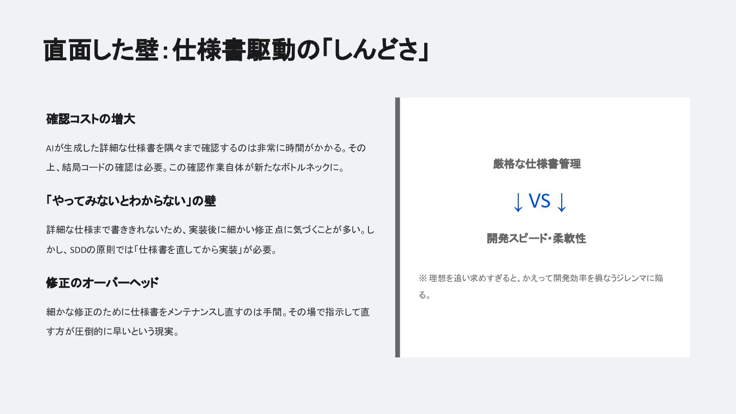 結論は「厳格にやりすぎず、仕様書を手段として割り切る」こと。AI開発の理想と現実を等身大でまとめたLTです。