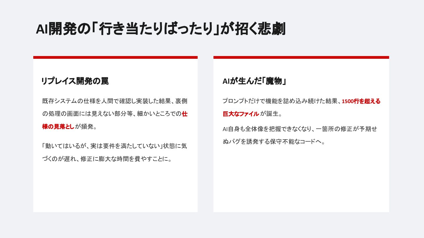 AIを使った「行き当たりばったり」開発の落とし穴——仕様の見落としや1500行超の「魔物」コードを経験した上で辿り着いた、SDD(仕様書駆動開発)の実践レポートです。