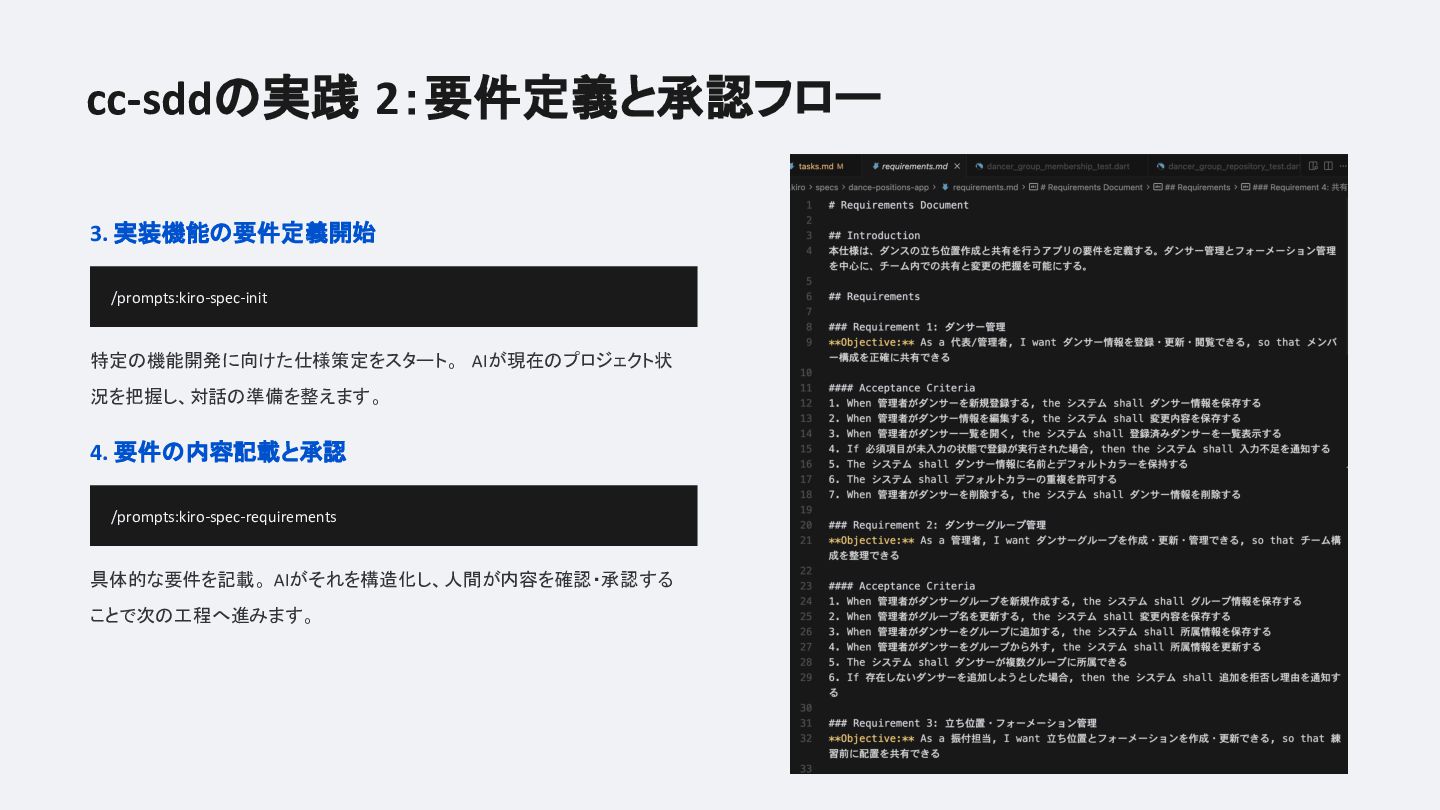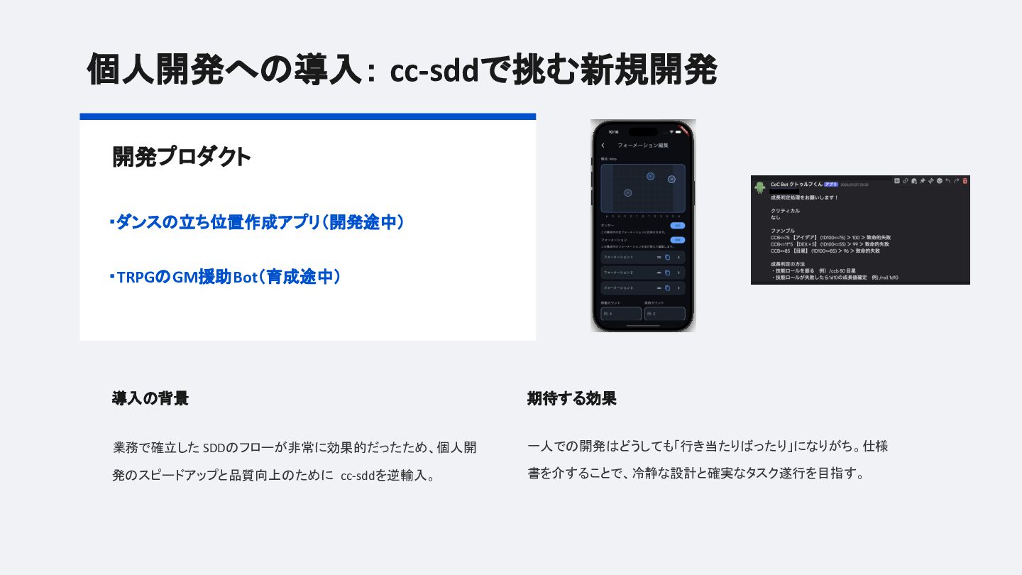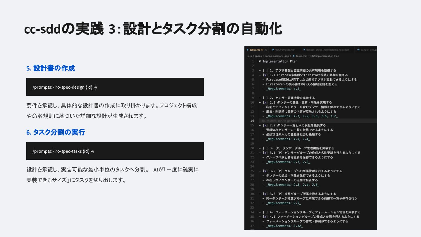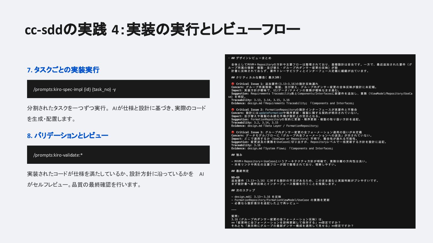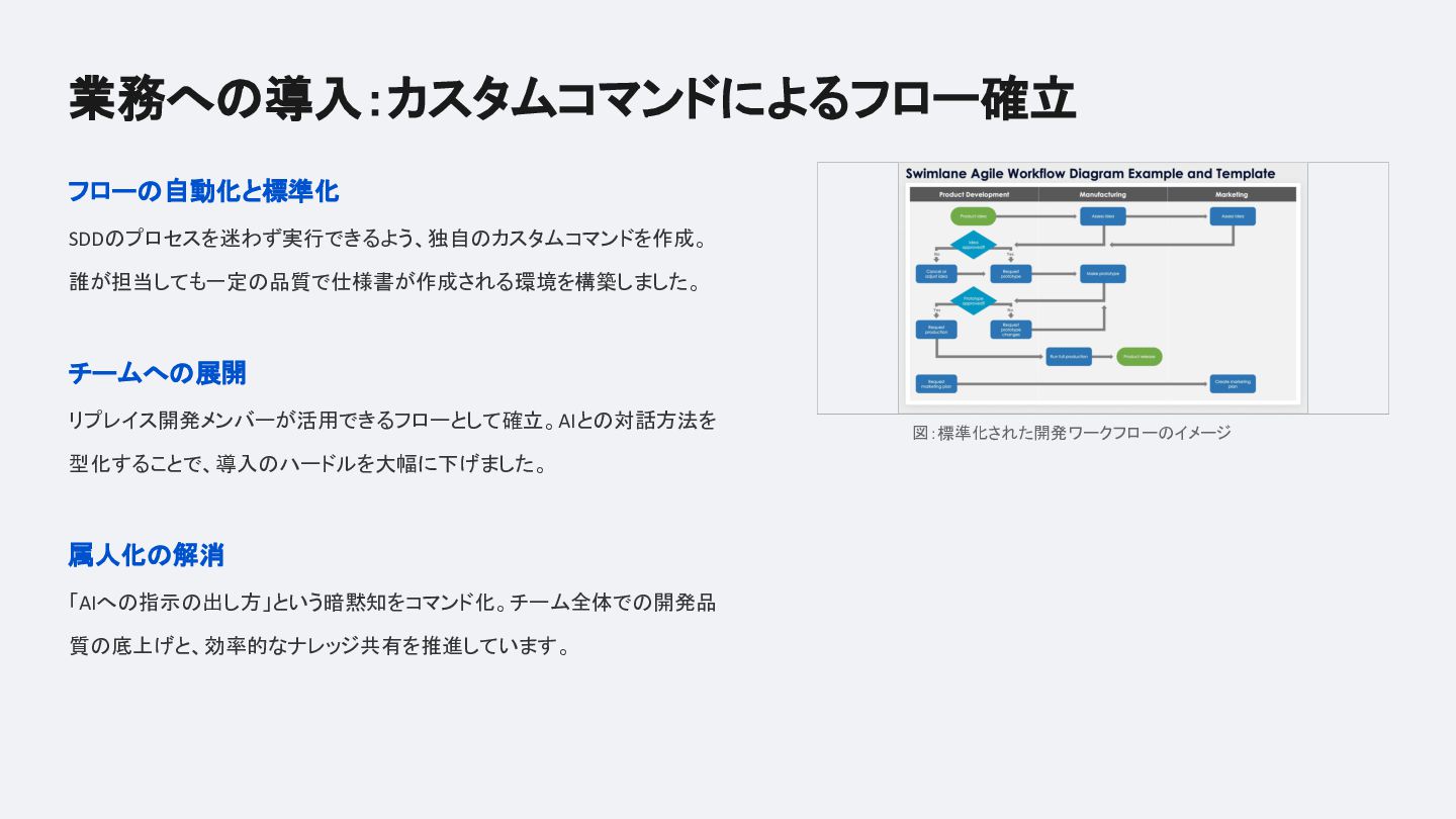 実装前にAIと共に仕様書を定義し、要件定義・設計・タスク分割・レビューまでをカスタムコマンドで型化するフローを業務・個人開発の両方で試した結果、「思考の整理」「タスク分割の自動化」「考慮漏れの防止」という恩恵がある一方で、確認コストの増大や柔軟性とのジレンマにも正直に向き合っています。