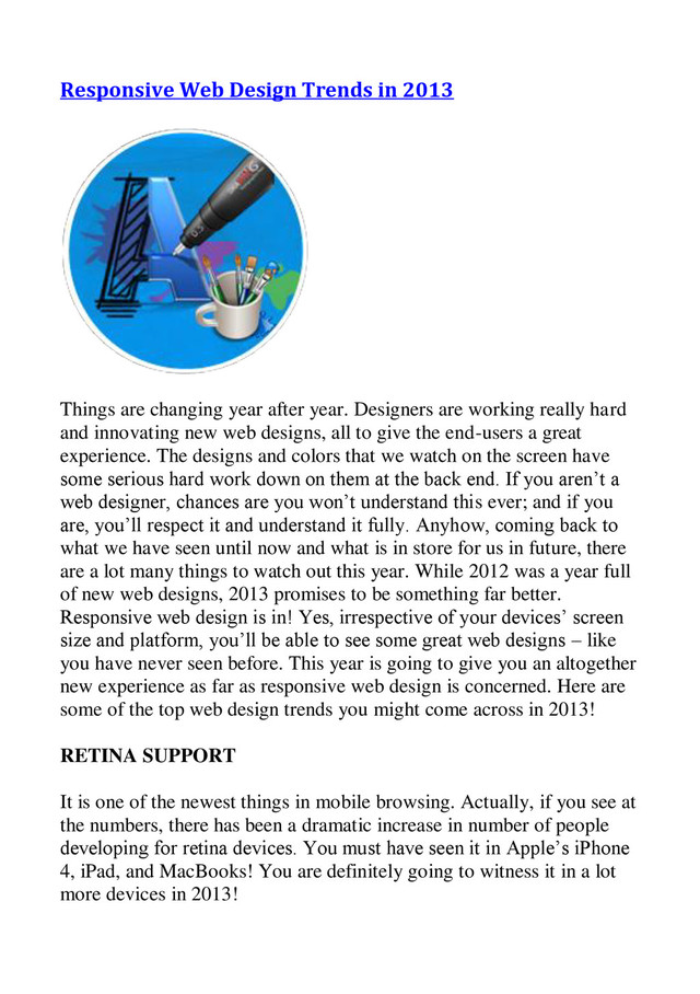 after year. Designers are working really hard and innovating new web designs, all to give the end-users a great experience. The designs and colors that we watch on the screen have some serious hard work down on them at the back end. If you aren’t a web designer, chances are you won’t understand this ever; and if you are, you’ll respect it and understand it fully. Anyhow, coming back to what we have seen until now and what is in store for us in future, there are a lot many things to watch out this year. While 2012 was a year full of new web designs, 2013 promises to be something far better. Responsive web design is in! Yes, irrespective of your devices’ screen size and platform, you’ll be able to see some great web designs – like you have never seen before. This year is going to give you an altogether new experience as far as responsive web design is concerned. Here are some of the top web design trends you might come across in 2013! RETINA SUPPORT It is one of the newest things in mobile browsing. Actually, if you see at the numbers, there has been a dramatic increase in number of people developing for retina devices. You must have seen it in Apple’s iPhone 4, iPad, and MacBooks! You are definitely going to witness it in a lot more devices in 2013!