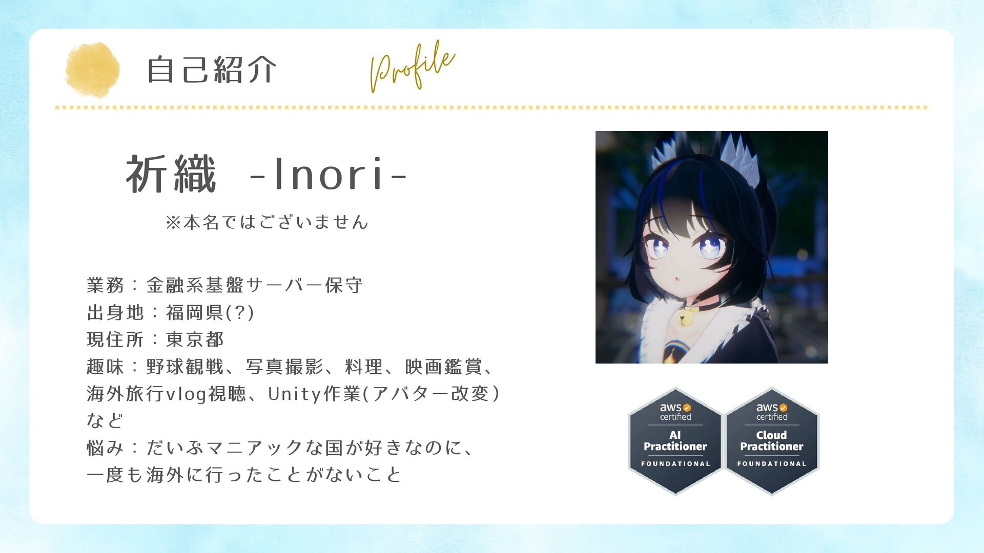業務:金融系基盤サーバー保守 出身地:福岡県(?) 現住所:東京都 趣味:野球観戦、写真撮影、料理、映画鑑賞、 海外旅行vlog視聴、Unity作業(アバター改変) など 悩み:だいぶマニアックな国が好きなのに、 一度も海外に行ったことがないこと Profile 祈織