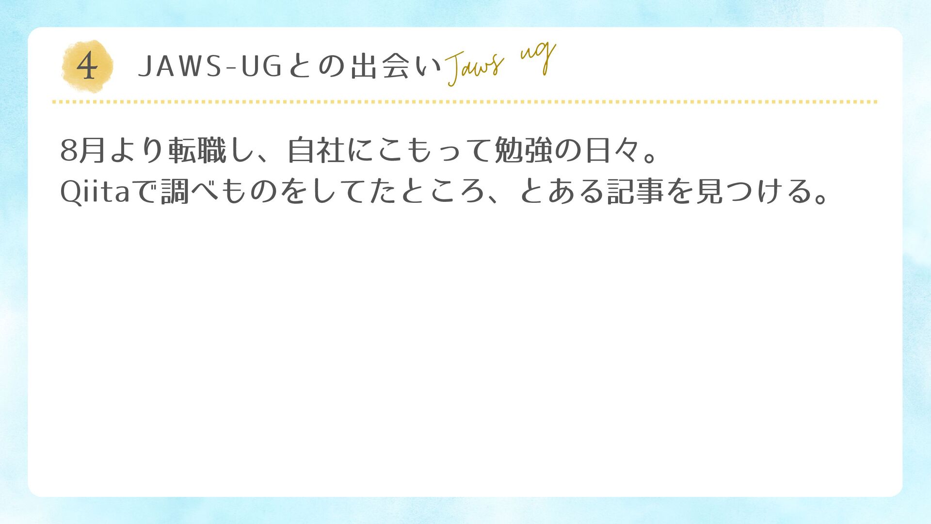 4 JAWS-UGとの出会い Jaws ug 8月より転職し、自社にこもって勉強の日々。 Qiitaで調べものをしてたところ、とある記事を見つける。