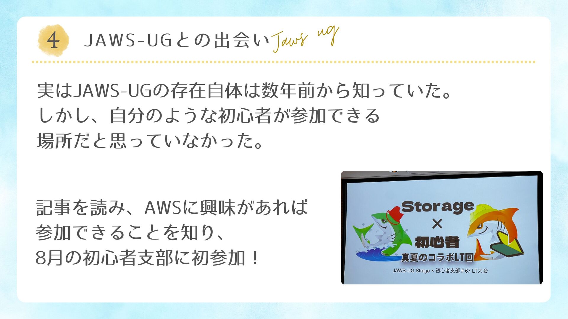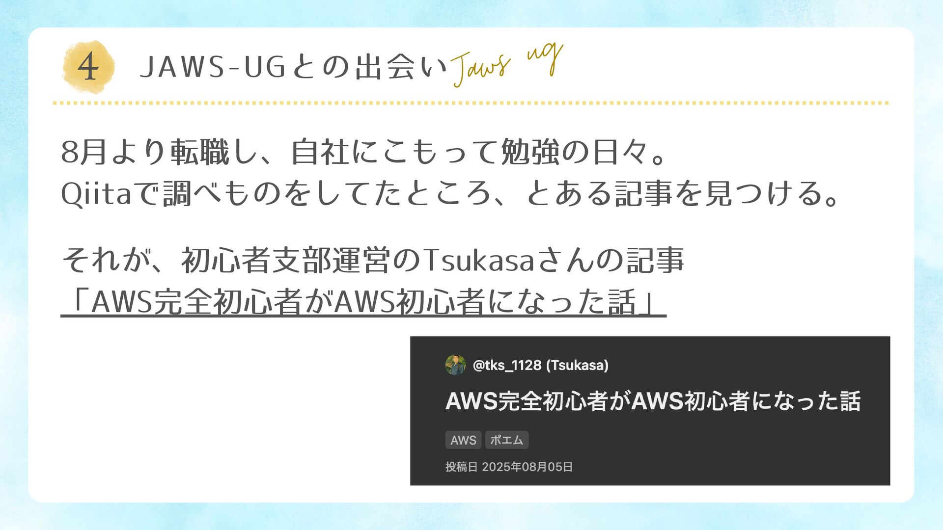 4 JAWS-UGとの出会い Jaws ug 8月より転職し、自社にこもって勉強の日々。 Qiitaで調べものをしてたところ、とある記事を見つける。 それが、初心者支部運営のTsukasaさんの記事 「AWS完全初心者がAWS初心者になった話」