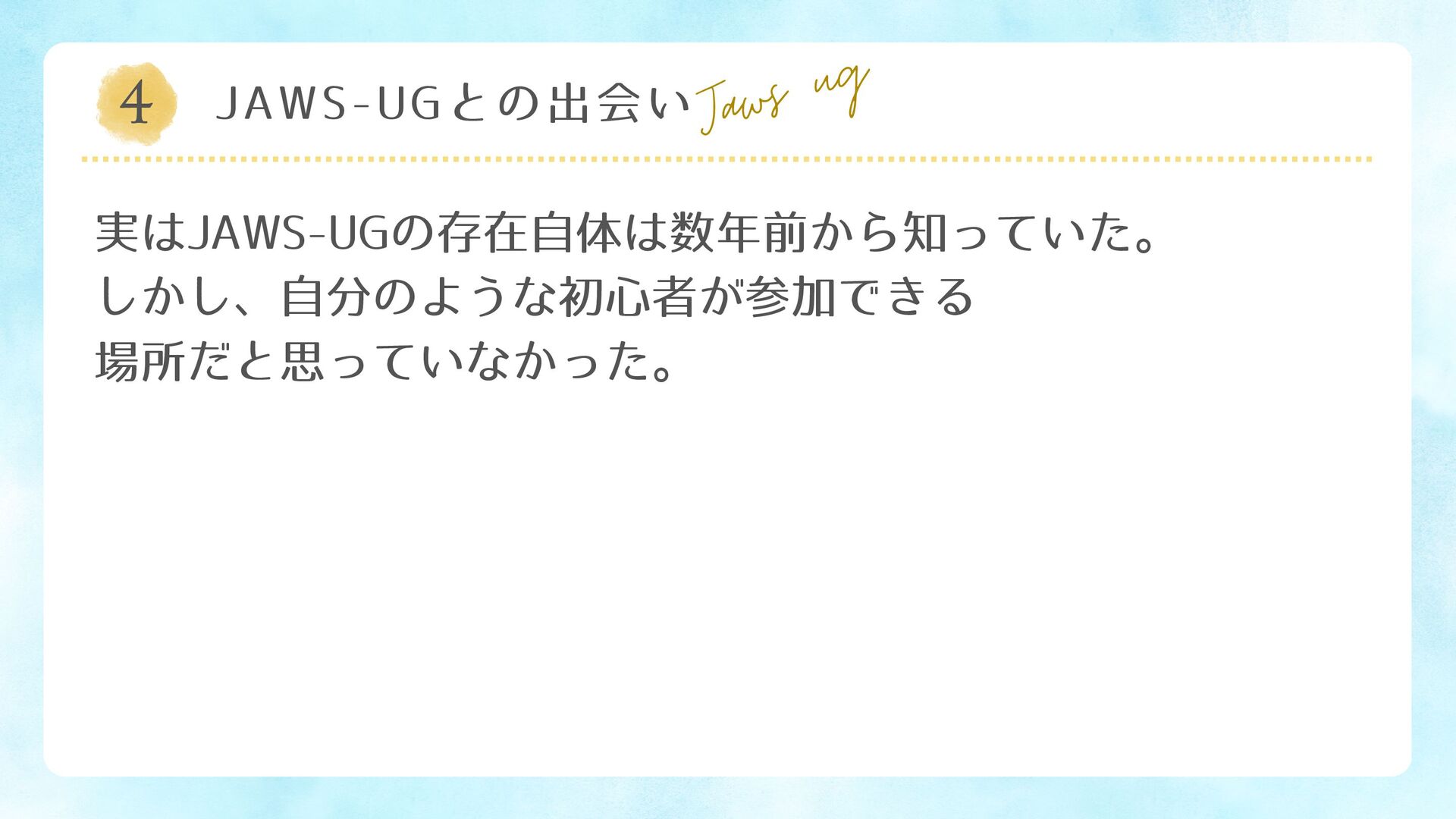 4 JAWS-UGとの出会い Jaws ug 実はJAWS-UGの存在自体は数年前から知っていた。 しかし、自分のような初心者が参加できる 場所だと思っていなかった。