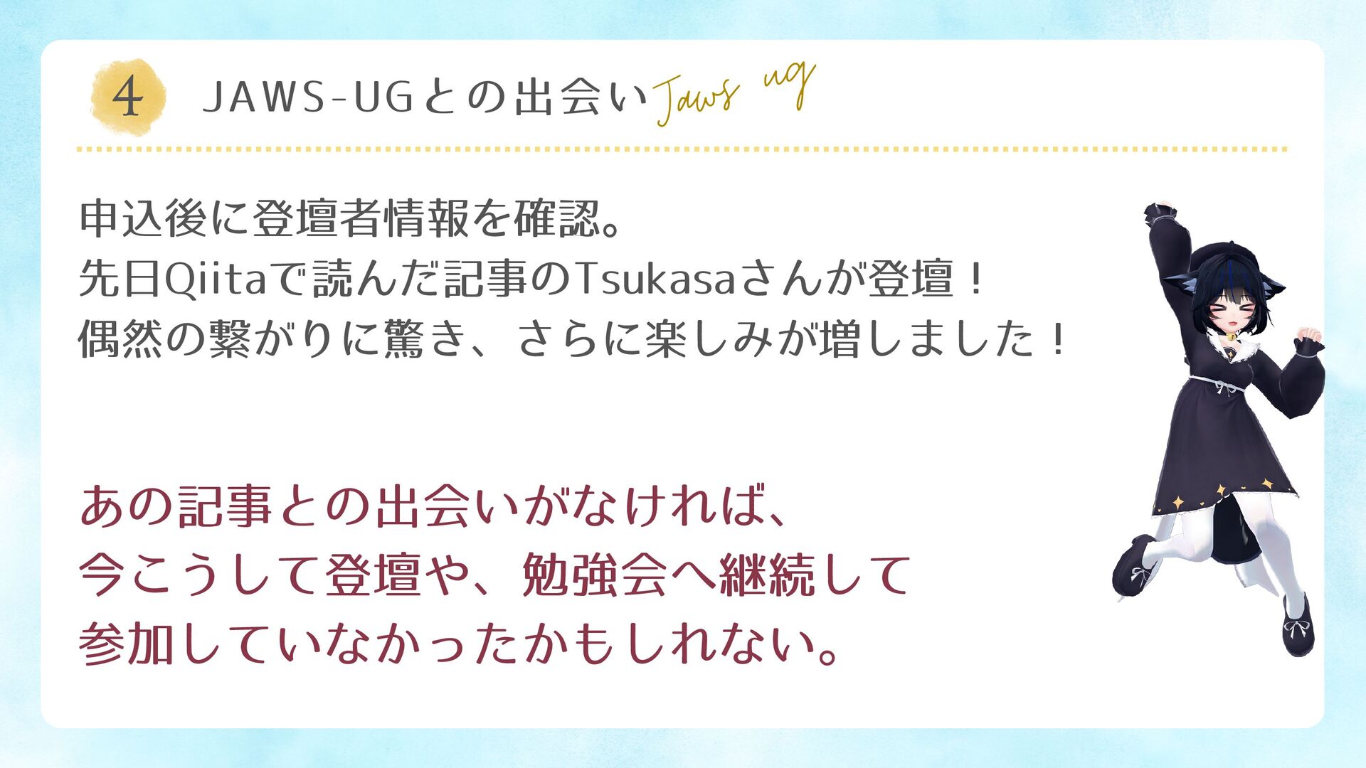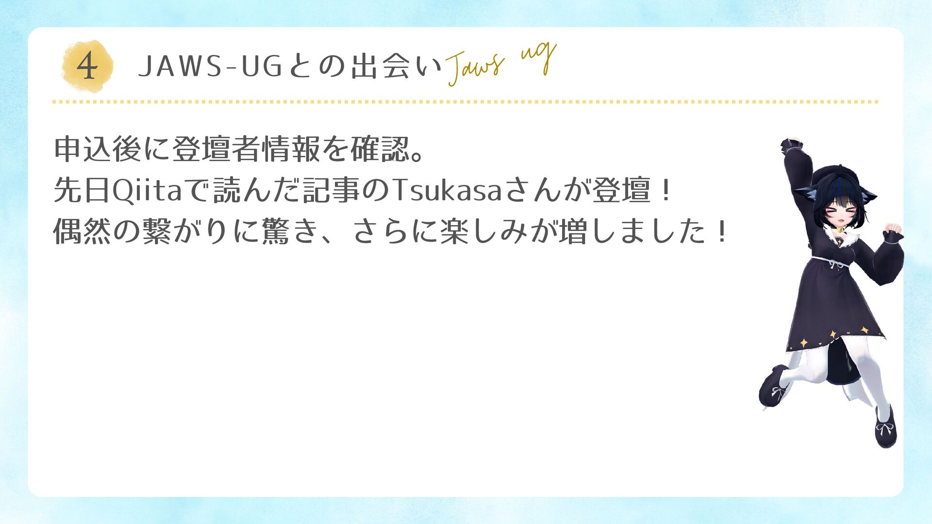 4 JAWS-UGとの出会い Jaws ug 申込後に登壇者情報を確認。 先日Qiitaで読んだ記事のTsukasaさんが登壇! 偶然の繋がりに驚き、さらに楽しみが増しました!