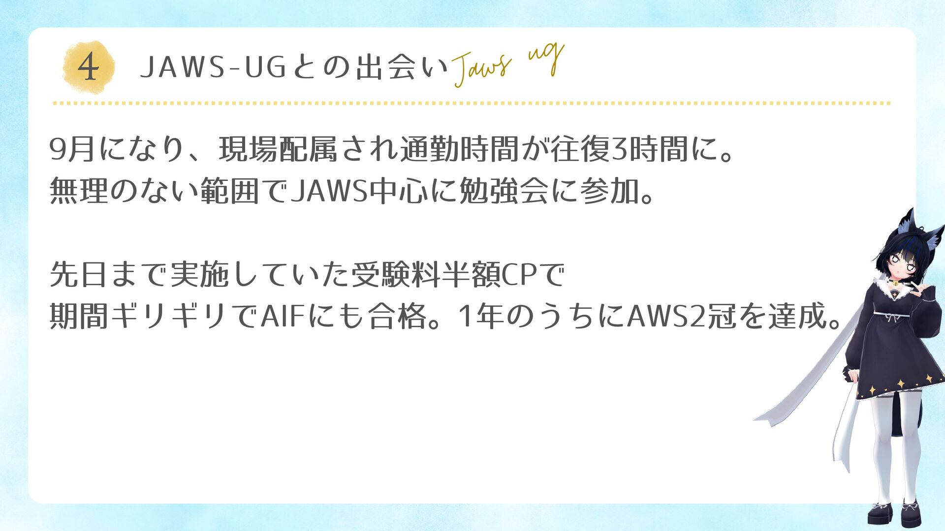 4 JAWS-UGとの出会い Jaws ug 9月になり、現場配属され通勤時間が往復3時間に。 無理のない範囲でJAWS中心に勉強会に参加。 先日まで実施していた受験料半額CPで 期間ギリギリでAIFにも合格。1年のうちにAWS2冠を達成。
