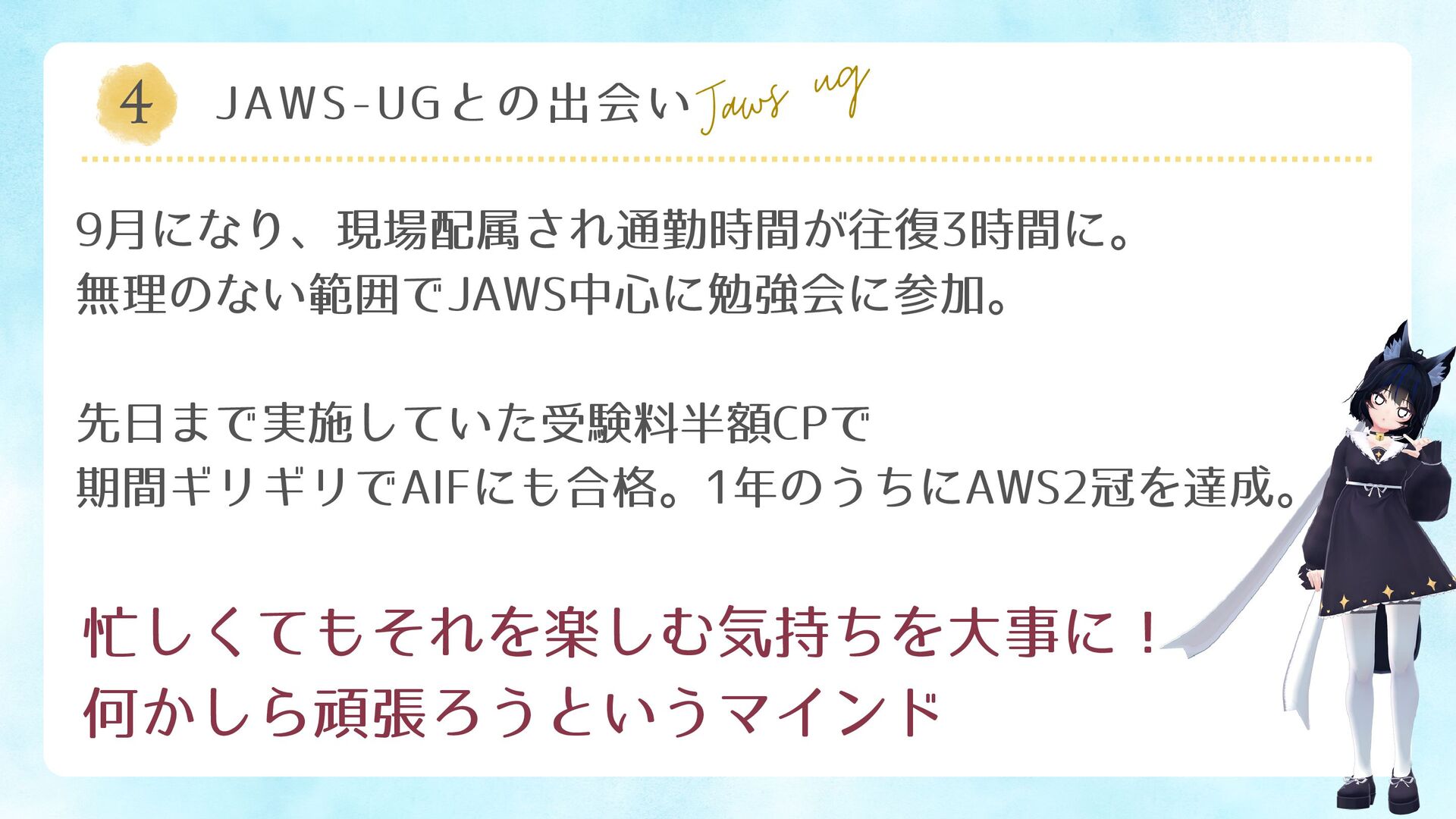 4 JAWS-UGとの出会い Jaws ug 9月になり、現場配属され通勤時間が往復3時間に。 無理のない範囲でJAWS中心に勉強会に参加。 先日まで実施していた受験料半額CPで 期間ギリギリでAIFにも合格。1年のうちにAWS2冠を達成。 忙しくてもそれを楽しむ気持ちを大事に! 何かしら頑張ろうというマインド
