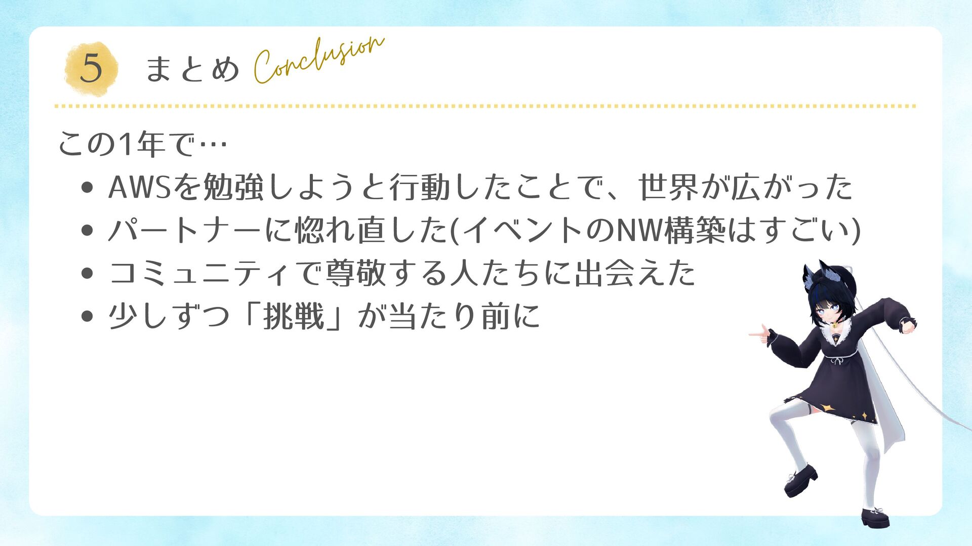 5 まとめ Conclusion この1年で… AWSを勉強しようと行動したことで、世界が広がった パートナーに惚れ直した(イベントのNW構築はすごい) コミュニティで尊敬する人たちに出会えた 少しずつ「挑戦」が当たり前に