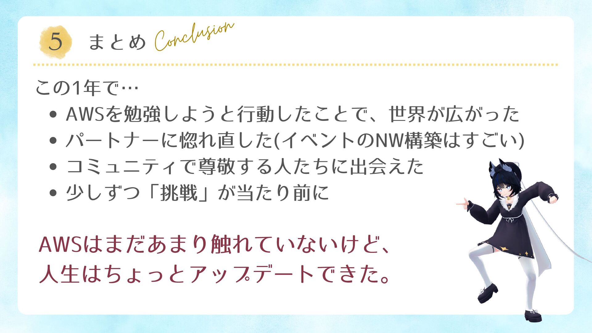 5 まとめ Conclusion この1年で… AWSを勉強しようと行動したことで、世界が広がった パートナーに惚れ直した(イベントのNW構築はすごい) コミュニティで尊敬する人たちに出会えた 少しずつ「挑戦」が当たり前に AWSはまだあまり触れていないけど、 人生はちょっとアップデートできた。