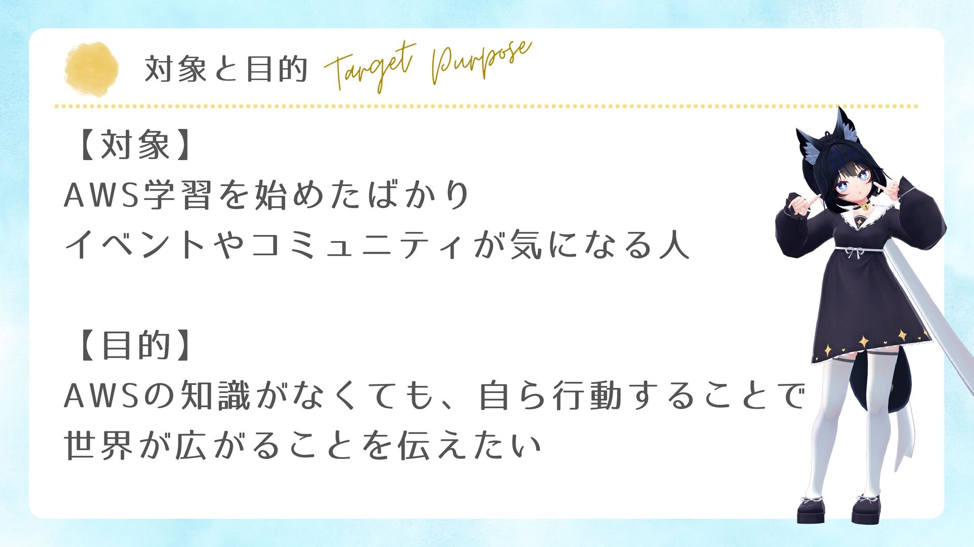 【対象】 AWS学習を始めたばかり イベントやコミュニティが気になる人 【目的】 AWSの知識がなくても、自ら行動することで 世界が広がることを伝えたい 対象と目的 Target Purpose