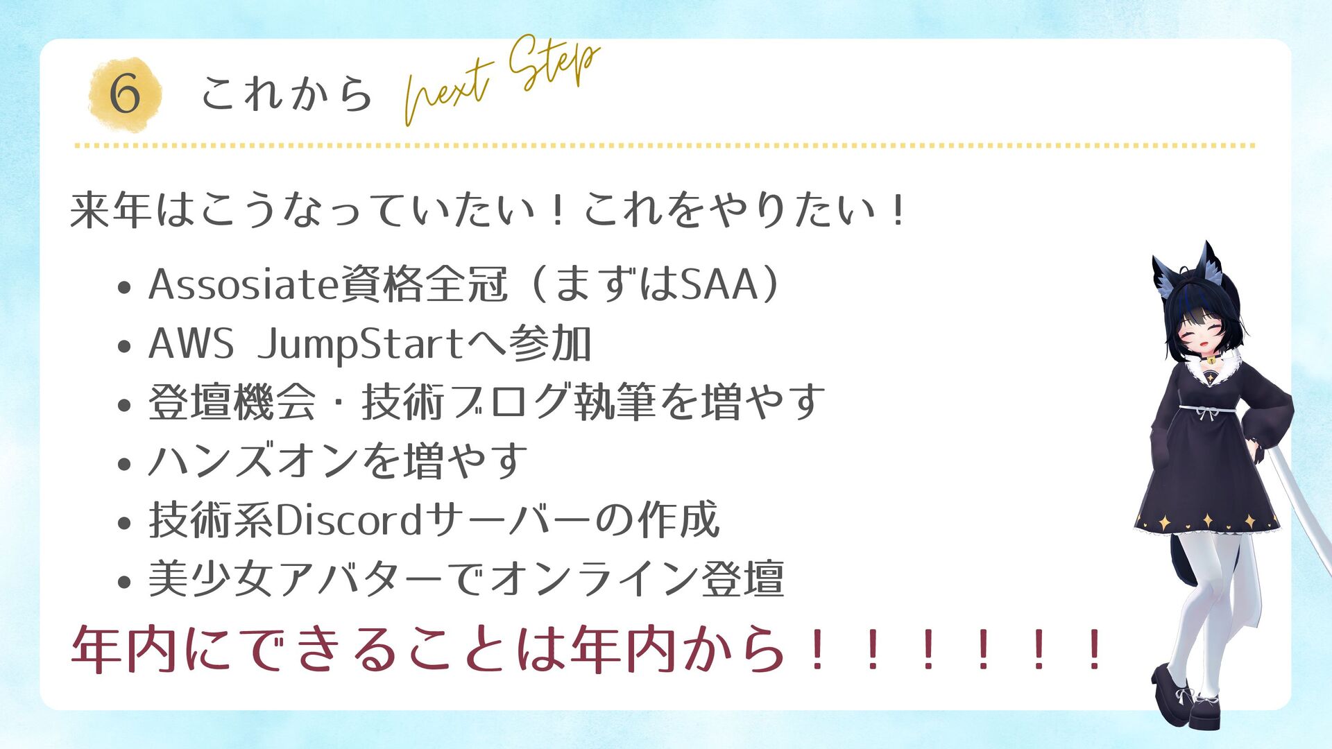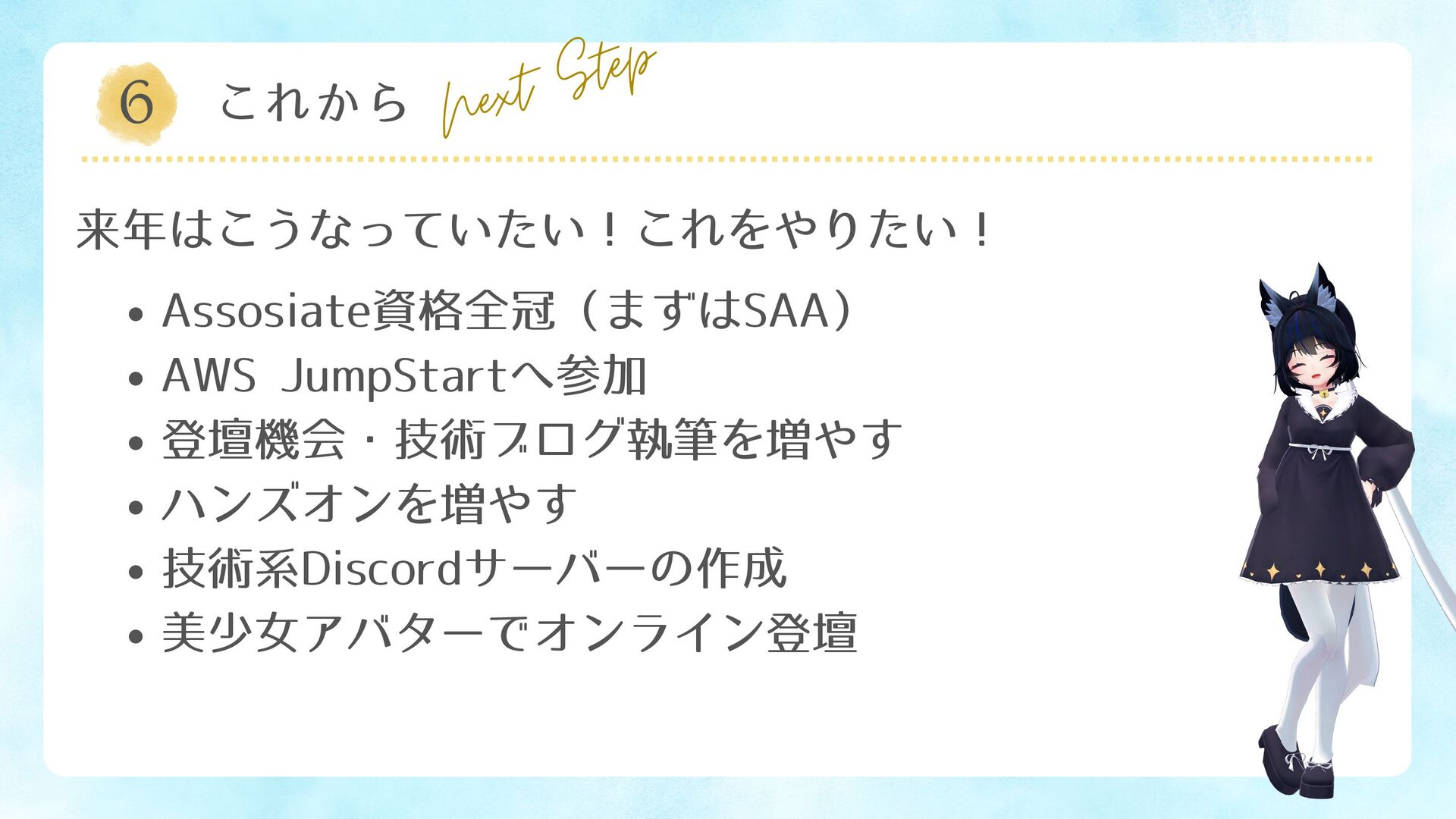 6 これから Next Step 来年はこうなっていたい!これをやりたい! Assosiate資格全冠(まずはSAA) AWS JumpStartへ参加 登壇機会・技術ブログ執筆を増やす ハンズオンを増やす