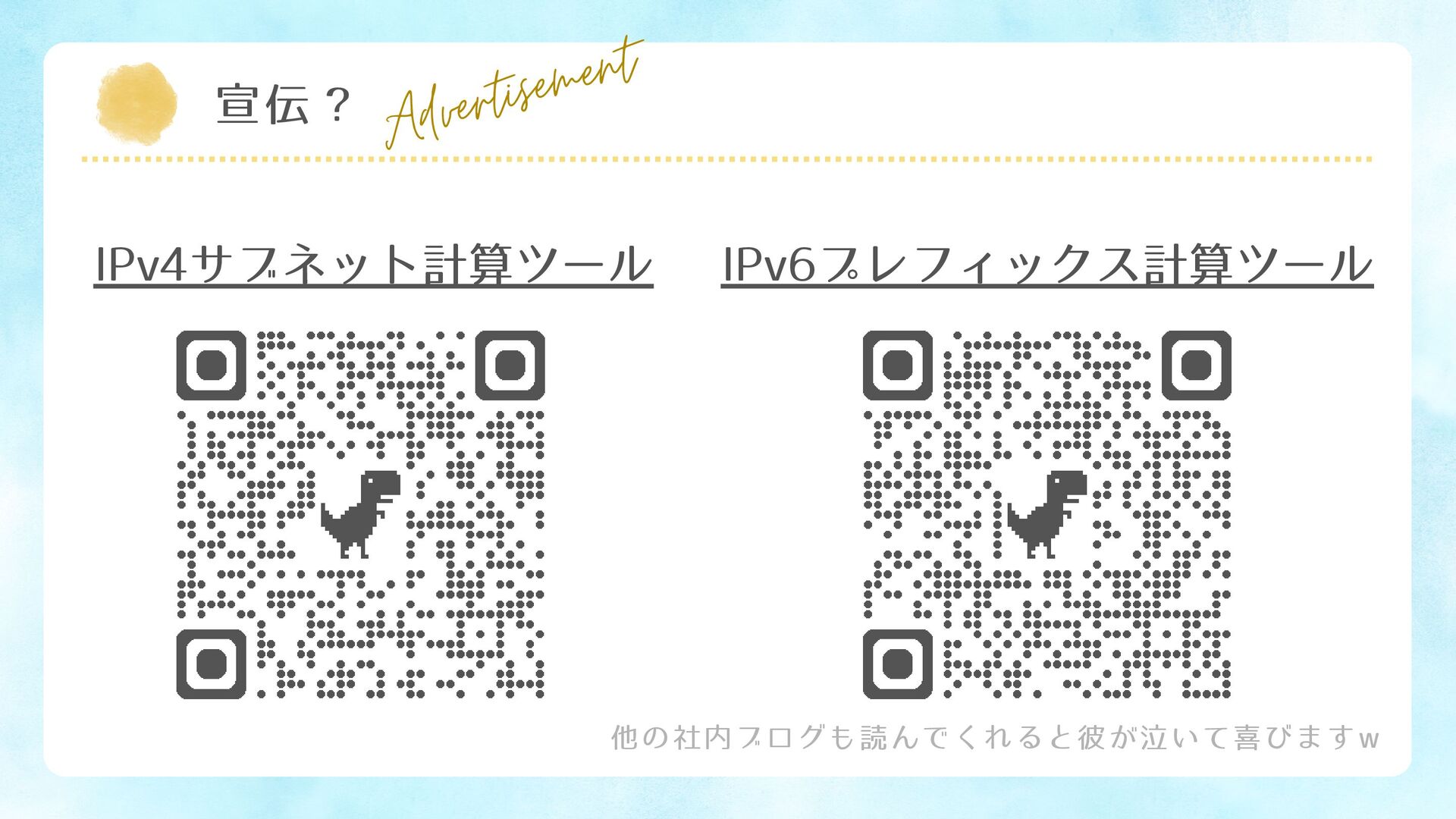 宣伝? Advertisement IPv4サブネット計算ツール IPv6プレフィックス計算ツール 他の社内ブログも読んでくれると彼が泣いて喜びますw