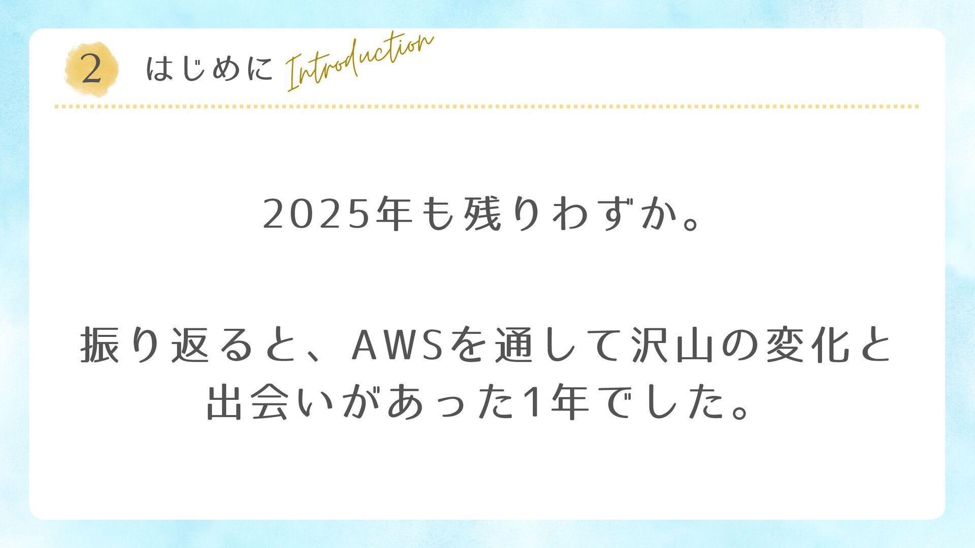 2 はじめに Introduction 2025年も残りわずか。 振り返ると、AWSを通して沢山の変化と 出会いがあった1年でした。