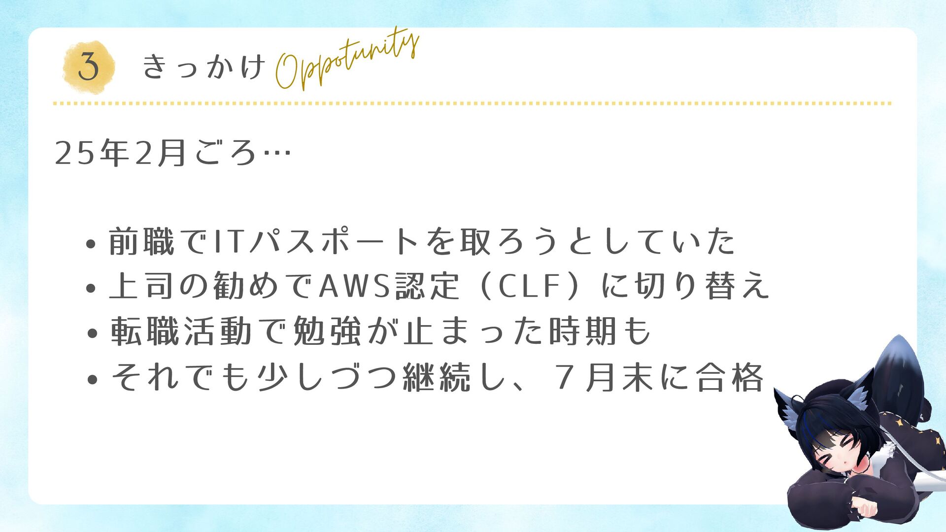 3 きっかけ Oppotunity 25年2月ごろ… 前職でITパスポートを取ろうとしていた 上司の勧めでAWS認定(CLF)に切り替え 転職活動で勉強が止まった時期も それでも少しづつ継続し、7月末に合格