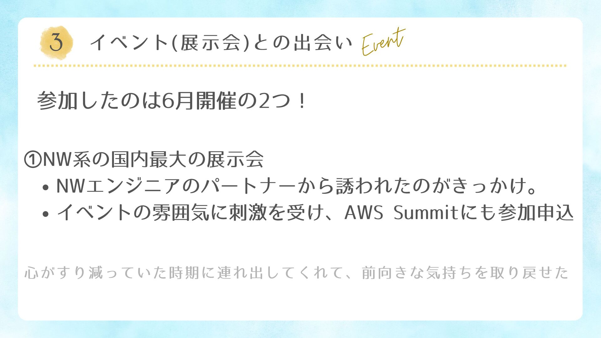 3 イベント(展示会)との出会い Event ①NW系の国内最大の展示会 NWエンジニアのパートナーから誘われたのがきっかけ。 イベントの雰囲気に刺激を受け、AWS Summitにも参加申込 参加したのは6月開催の2つ! 心がすり減っていた時期に連れ出してくれて、前向きな気持ちを取り戻せた