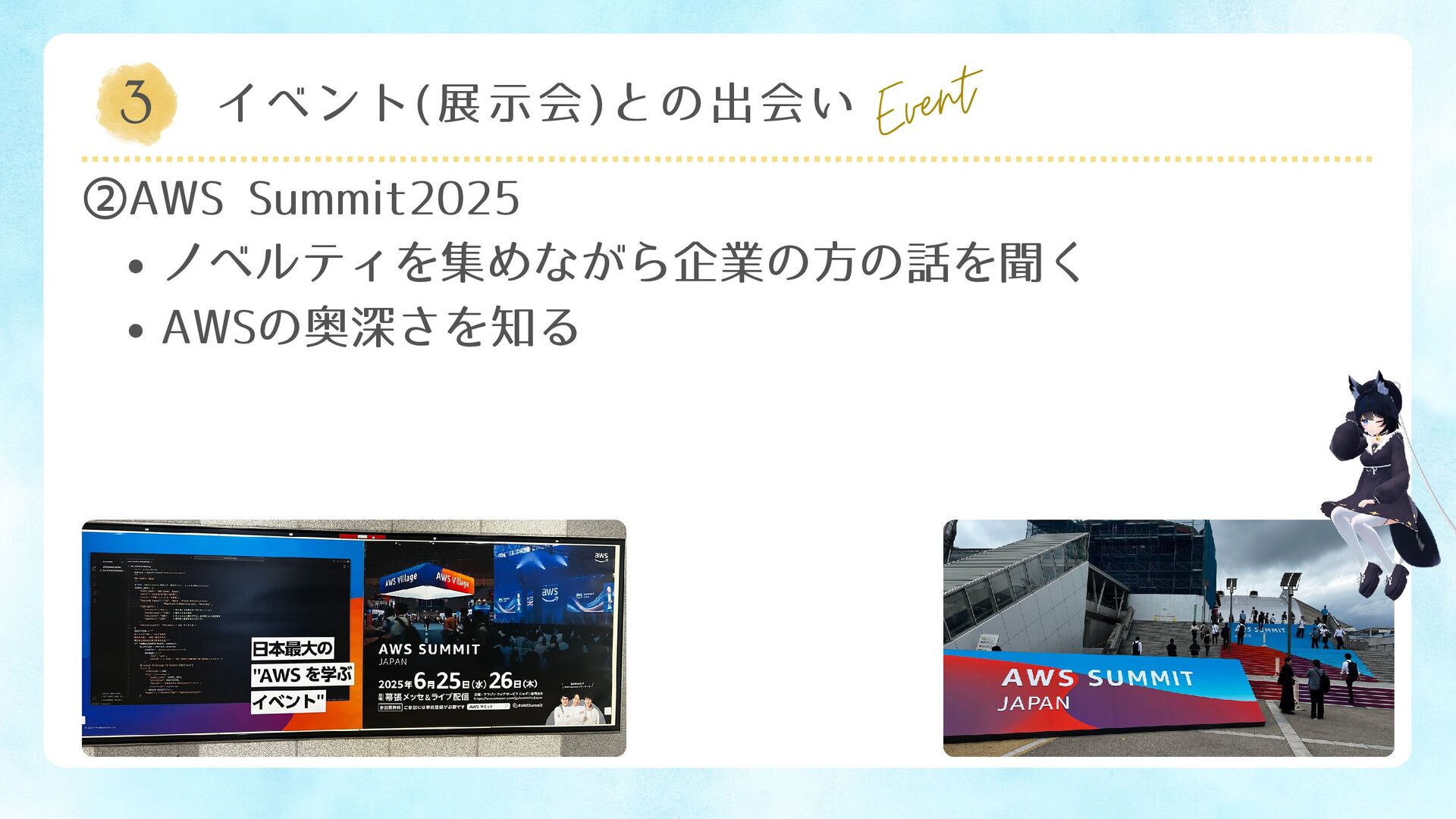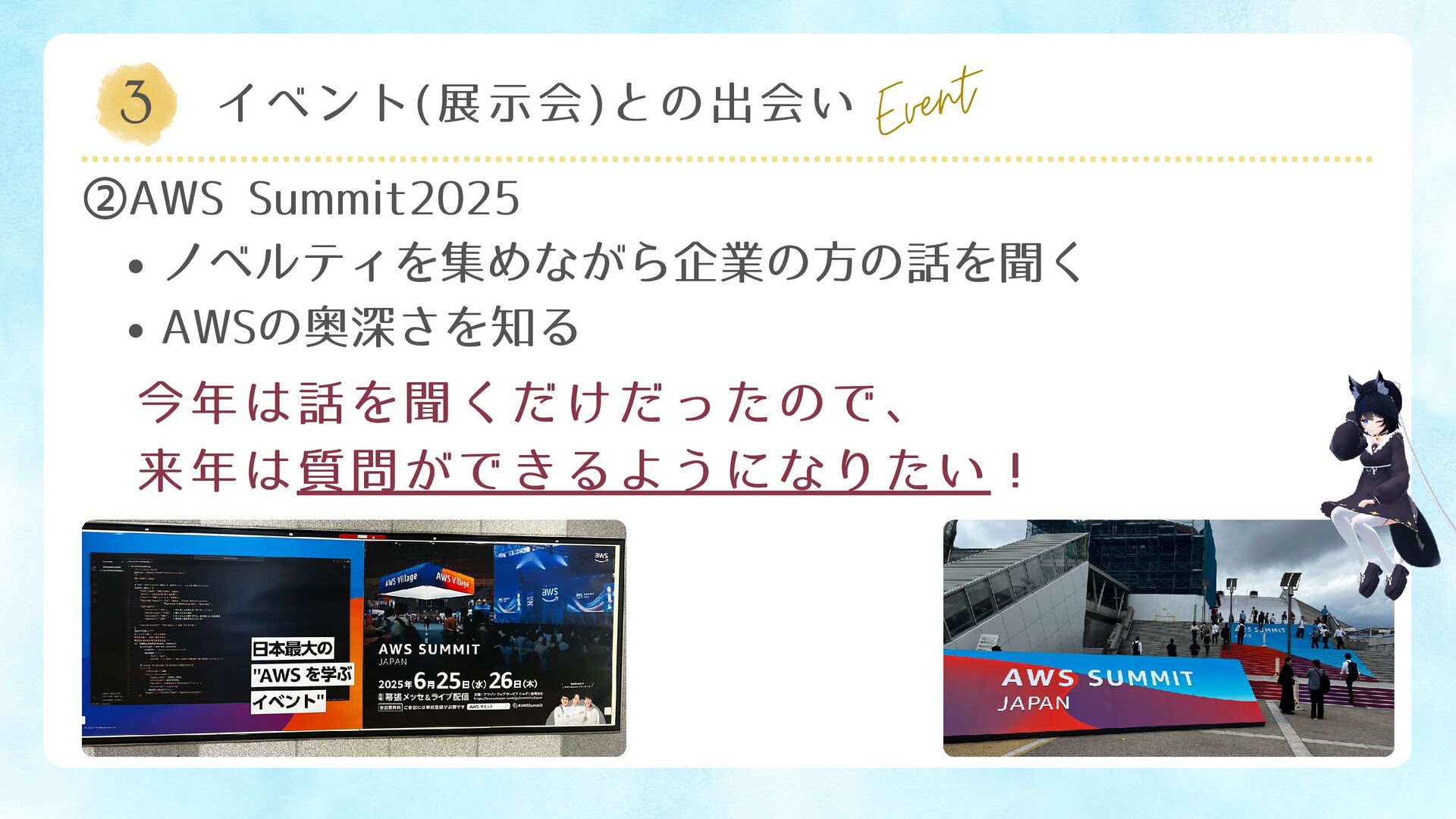 3 イベント(展示会)との出会い Event ②AWS Summit2025 ノベルティを集めながら企業の方の話を聞く AWSの奥深さを知る