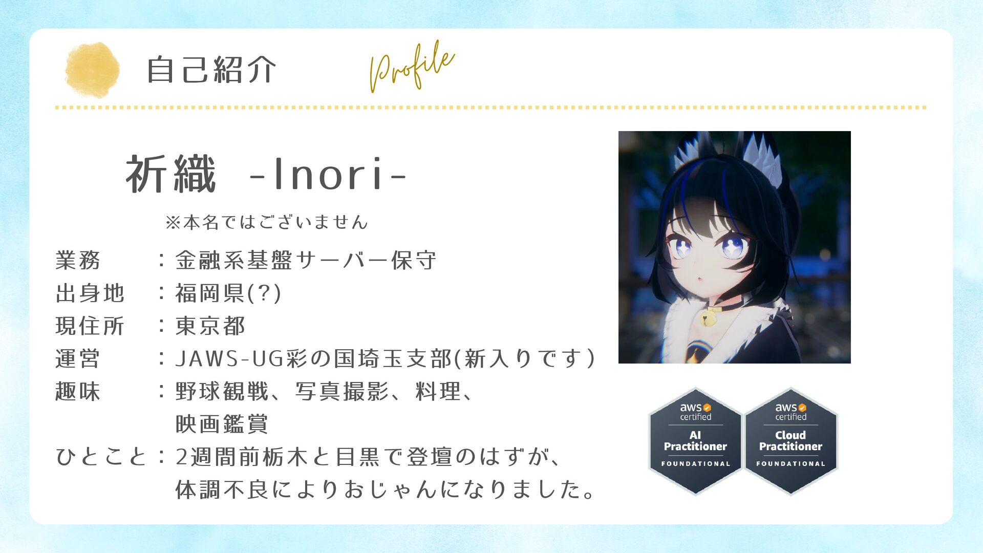 業務 :金融系基盤サーバー保守 出身地 :福岡県(?) 現住所 :東京都 運営 :JAWS-UG彩の国埼玉支部(新入りです) 趣味 :野球観戦、写真撮影、料理、 映画鑑賞 ひとこと:2週間前栃木と目黒で登壇のはずが、 体調不良によりおじゃんになりました。 Profile 祈織