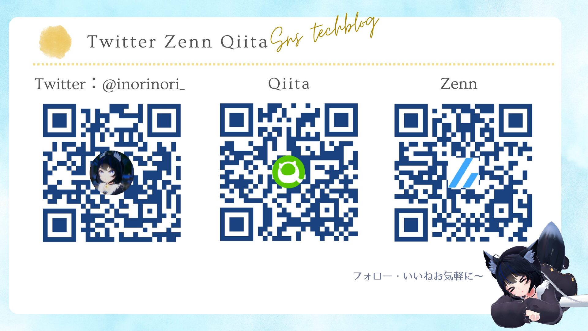 Twitter : @inorinori_ Zenn Twitter Zenn Qiita Sns techblog フォロー・いいねお気軽に〜