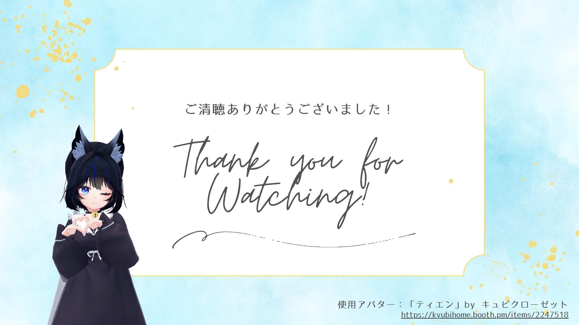 Thank you for Watching! ご清聴ありがとうございました! https://kyubihome.booth.pm/items/2247518 使用アバター:「ティエン」by キュビクローゼット