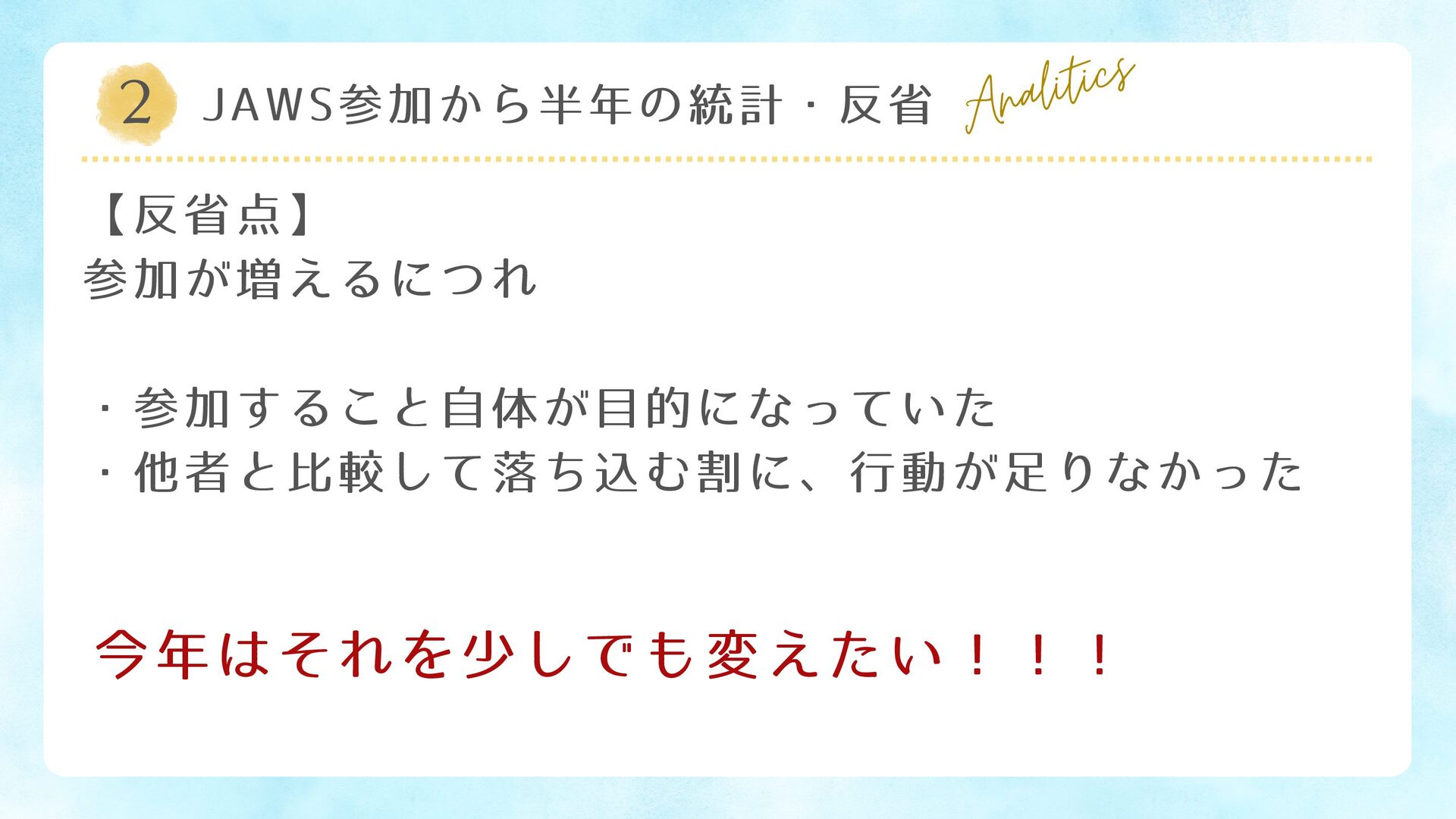2 JAWS参加から半年の統計・反省 Analitics 【反省点】 参加が増えるにつれ ・参加すること自体が目的になっていた ・他者と比較して落ち込む割に、行動が足りなかった 今年はそれを少しでも変えたい!!!