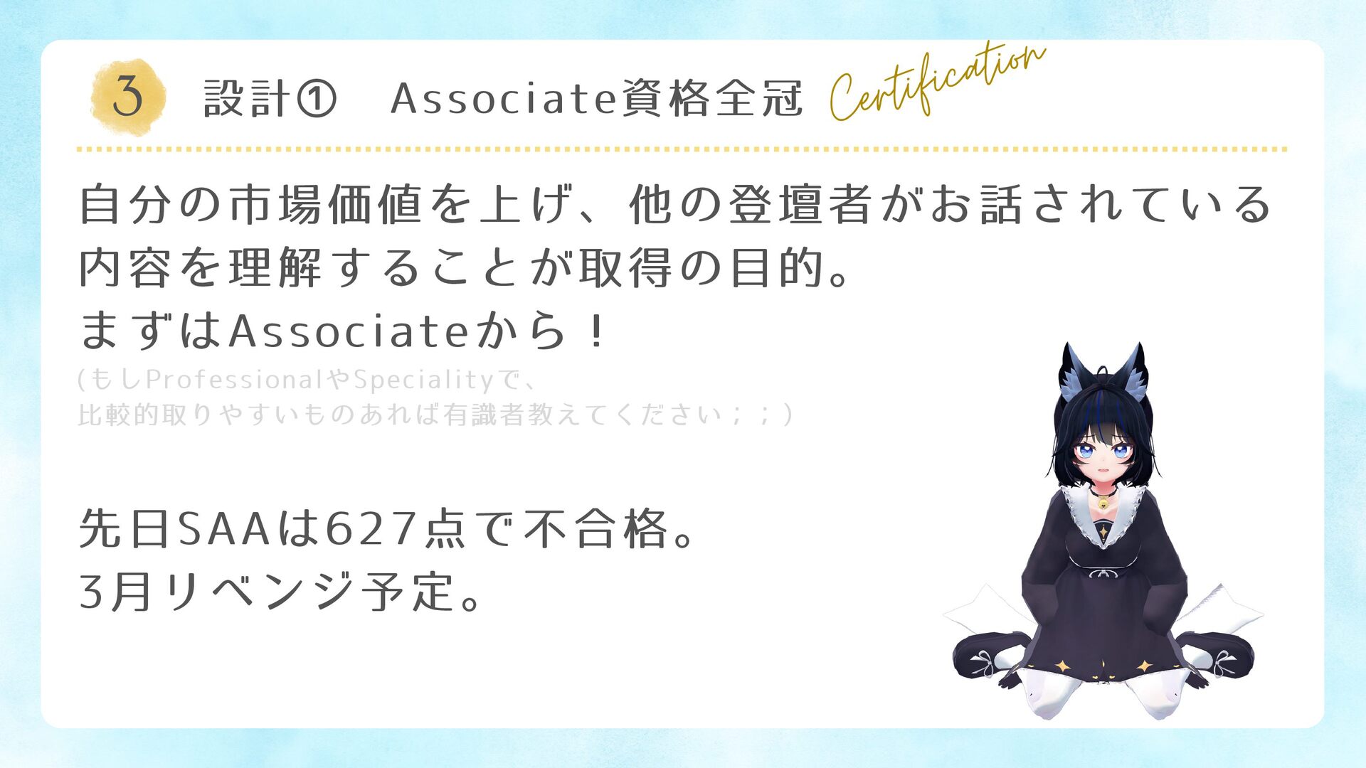 3 設計① Associate資格全冠 Certification 自分の市場価値を上げ、他の登壇者がお話されている 内容を理解することが取得の目的。 まずはAssociateから! (もしProfessionalやSpecialityで、 比較的取りやすいものあれば有識者教えてください;;) 先日SAAは627点で不合格。 3月リベンジ予定。