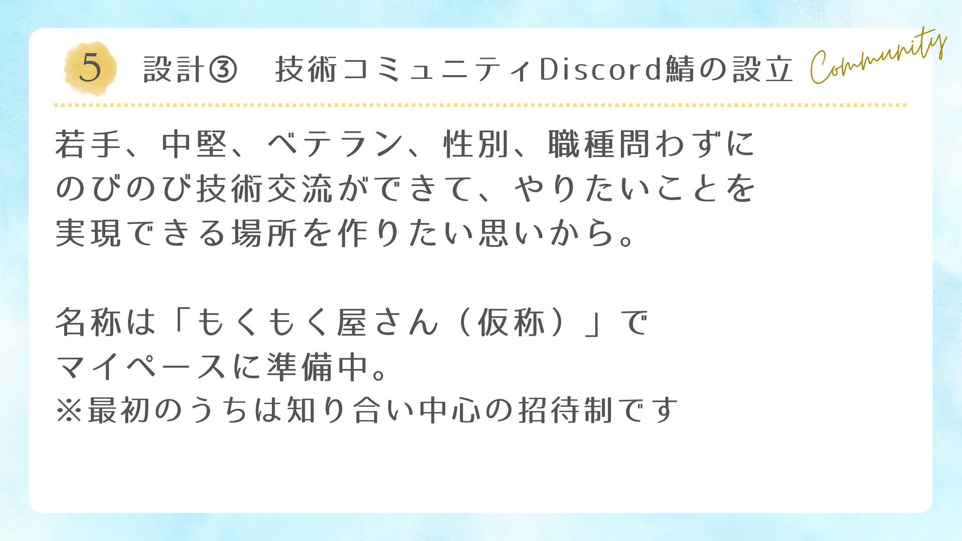 5 設計③ 技術コミュニティDiscord鯖の設立 Community 若手、中堅、ベテラン、性別、職種問わずに のびのび技術交流ができて、やりたいことを 実現できる場所を作りたい思いから。 名称は「もくもく屋さん(仮称)」で マイペースに準備中。 ※最初のうちは知り合い中心の招待制です