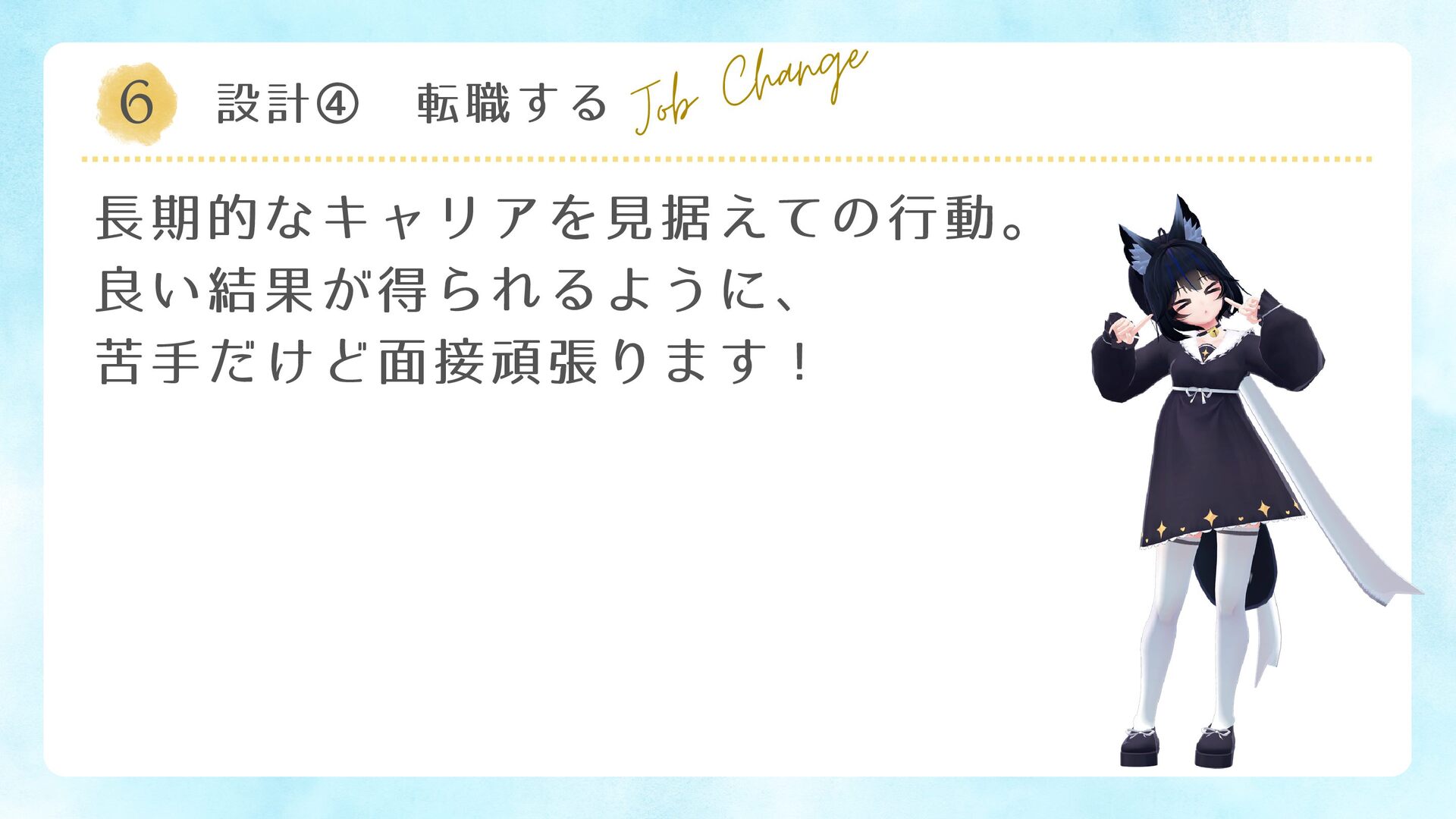 6 設計④ 転職する Job Change 長期的なキャリアを見据えての行動。 良い結果が得られるように、 苦手だけど面接頑張ります!