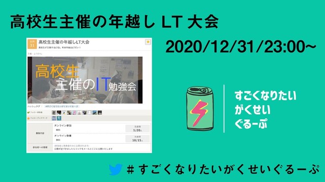 年越しLT⼤会特別ルール ・⼈数が多いので,5-10分程度で発表をお願いします(普段は40minとかでもOK) ・発表順は各登壇が終わった後にルーレットで決めていきます!! ・LTのアーカイブはyoutubeにて公開する予定です。ダメな⼈は⾔ってね ・#すごくなりたいがくせいぐるーぷ ツイートもお願いしますね!! ではスタートしていきましょう!!