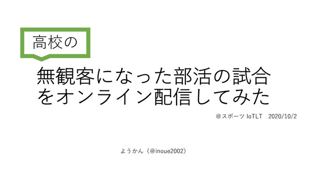 無観客になった部活の試合 をオンライン配信してみた @スポーツ IoTLT 2020/10/2 ようかん(@inoue2002) ⾼校の