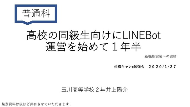 ⾼校の同級⽣向けにLINEBot 運営を始めて1年半 普通科 @梅キャンx勉強会 2020/1/27 ⽟川⾼等学校2年井上陽介 新機能実装への進捗 発表資料は後ほど共有させていただきます!