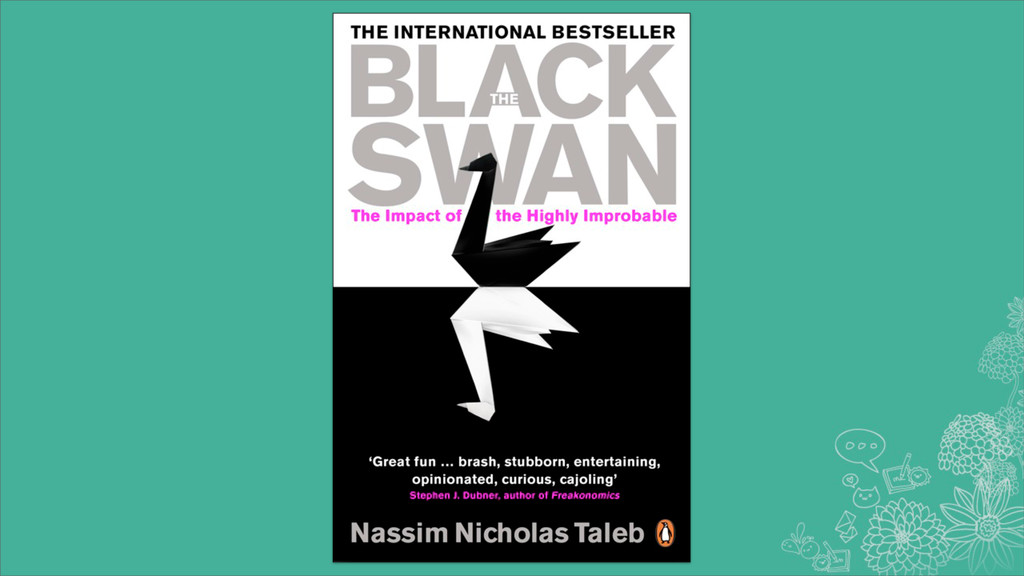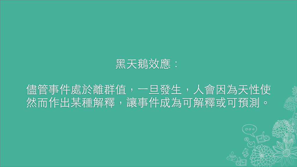 ⿊黑天鵝效應: 儘管事件處於離群值,⼀一旦發⽣生,⼈人會因為天性使 然⽽而作出某種解釋,讓事件成為可解釋或可預測。