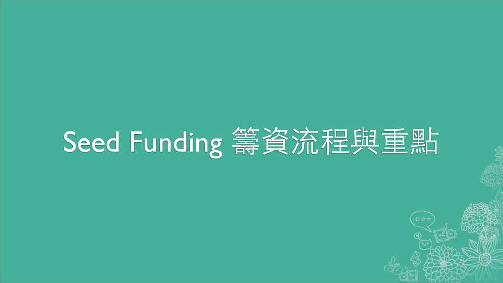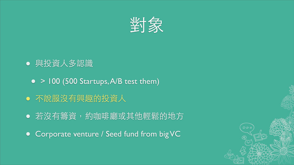 them) • 不說服沒有興趣的投資⼈人 • 若沒有籌資,約咖啡廳或其他輕鬆的地⽅方 • Corporate venture / Seed fund from big VC