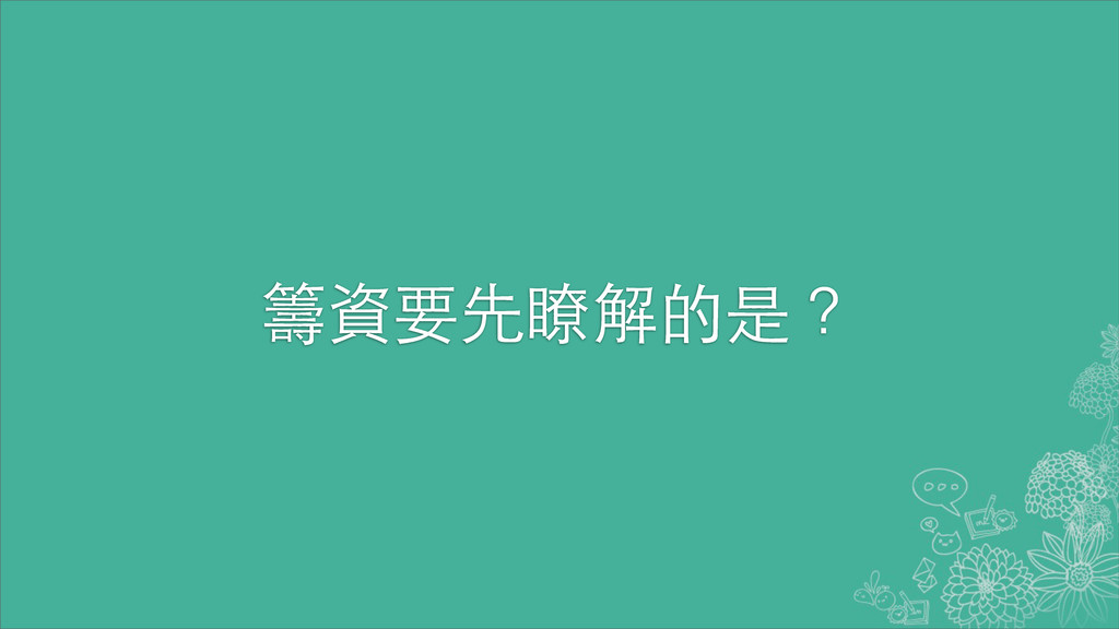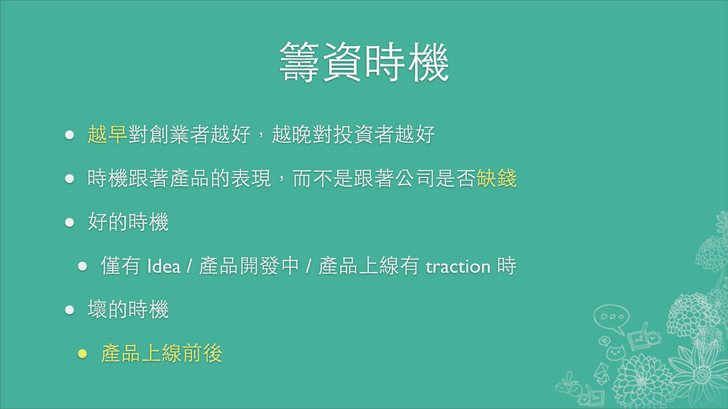 籌資時機 • 越早對創業者越好,越晚對投資者越好 • 時機跟著產品的表現,⽽而不是跟著公司是否缺錢 • 好的時機 • 僅有 Idea