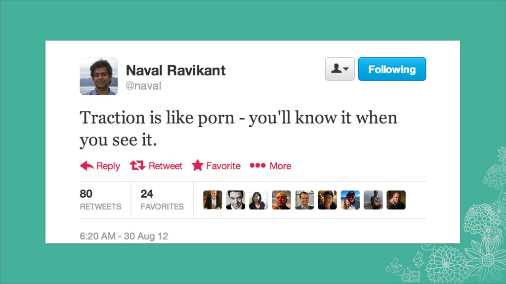 Engagement, Partnerships/clients, Traffic, ... • Brendan Baker (Greylock) • http://www.quora.com/Brendan-Baker/Posts/Startups-How-to- Communicate-Traction-to-Investors
