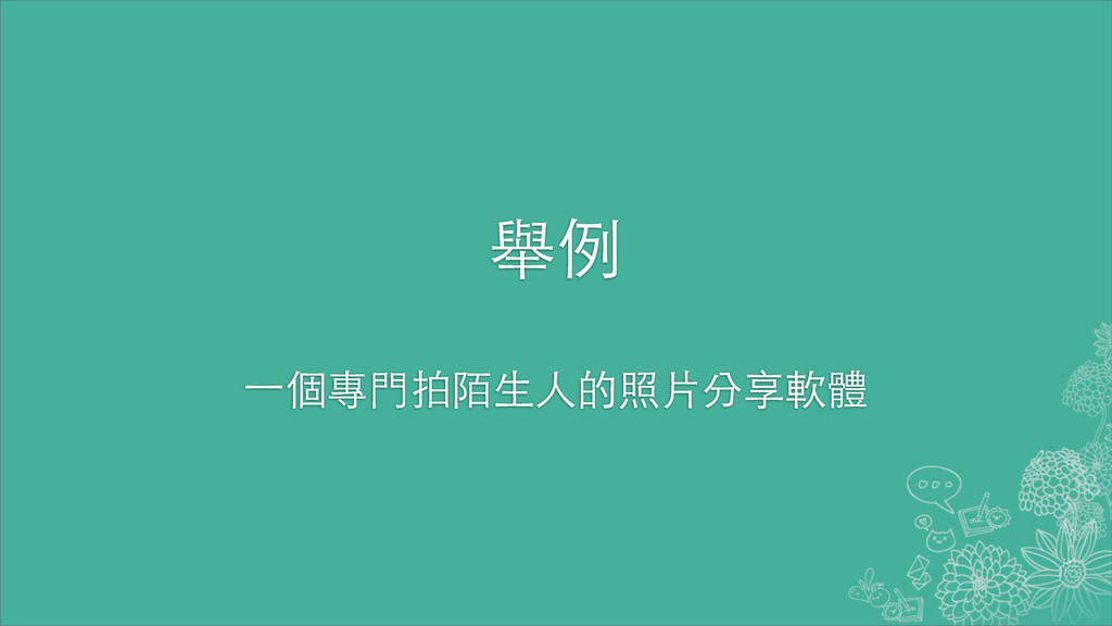 舉例 ⼀一個專⾨門拍陌⽣生⼈人的照⽚片分享軟體