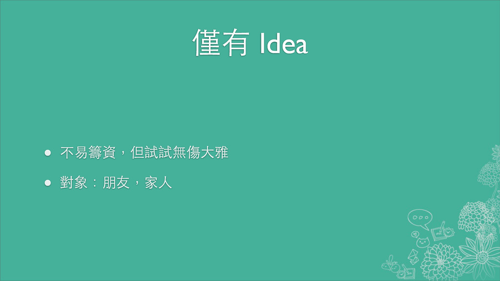 僅有 Idea • 不易籌資,但試試無傷⼤大雅 • 對象:朋友,家⼈人