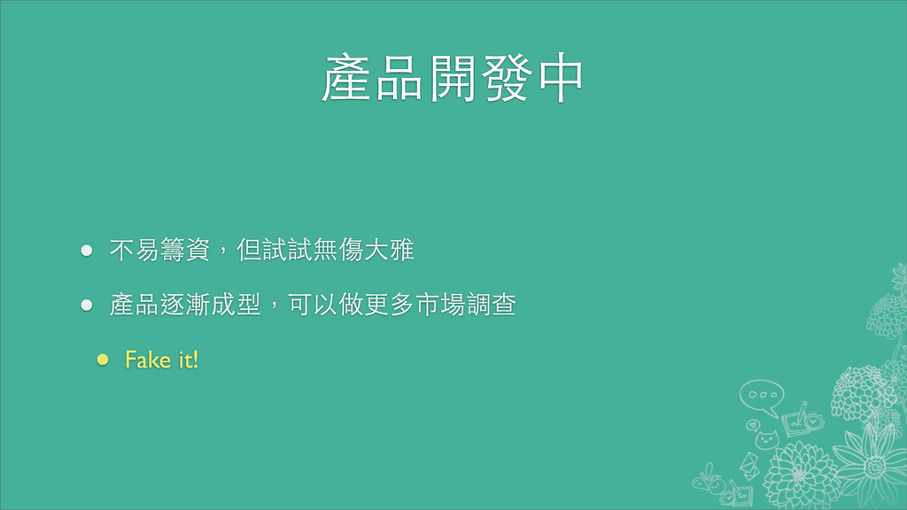 產品開發中 • 不易籌資,但試試無傷⼤大雅 • 產品逐漸成型,可以做更多市場調查 • Fake it!