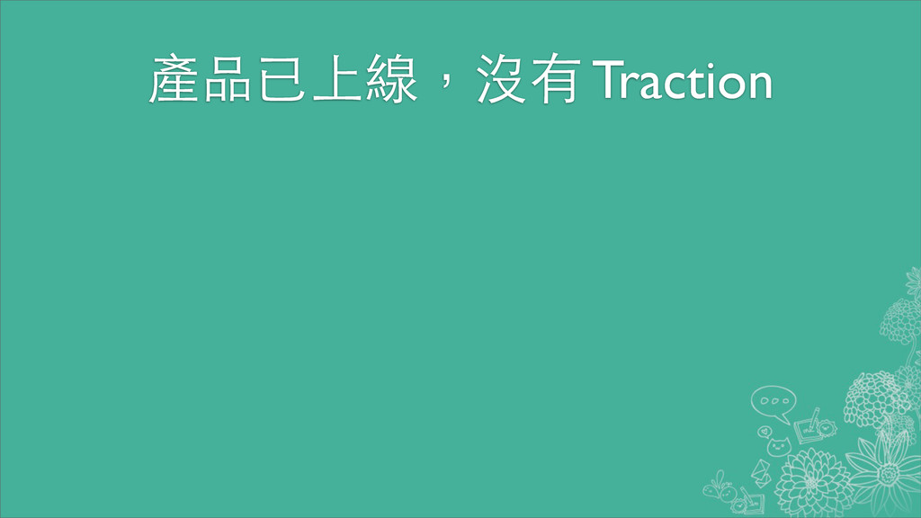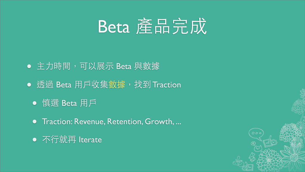 Traction • 慎選 Beta ⽤用⼾戶 • Traction: Revenue, Retention, Growth, ... • 不⾏行就再 Iterate