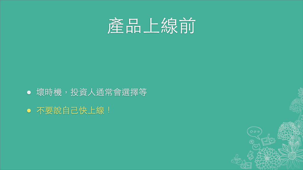 產品上線前 • 壞時機,投資⼈人通常會選擇等 • 不要說⾃自⼰己快上線!
