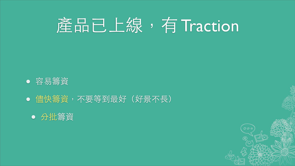 產品已上線,有 Traction • 容易籌資 • 儘快籌資,不要等到最好(好景不⻑⾧長) • 分批籌資